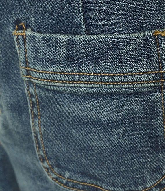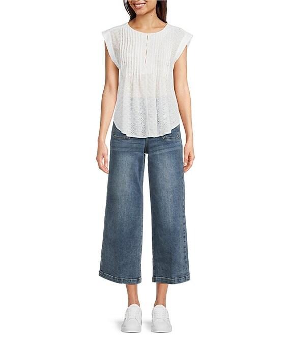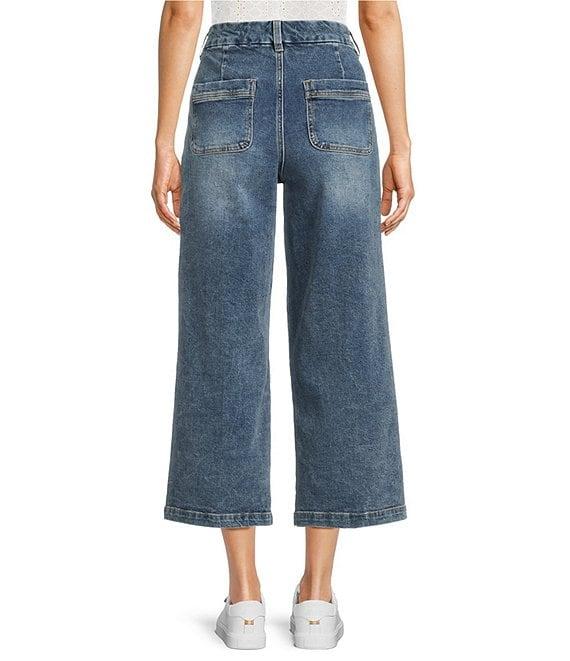 From Dear Jon, these jeans feature: Stretch denim fabrication Wide leg silhouette Belt loops High rise Front dart details 4 pocket styling Cropped length Front button and zipper closure Approx. 25" inseam, front rise: 12.5", back rise: 12.25" Cotton/spandex Machine wash Imported.