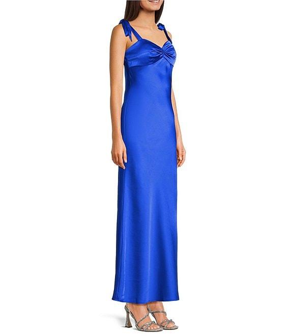 From Dear Moon, this ball gown features: Satin fabrication Sweetheart neckline Sleeveless Tie shoulders Twist front detail Pullover construction 56" length Polyester; lined Hand wash/line dry Imported.