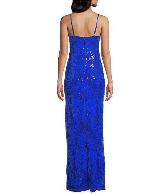 From Dear Moon, this dress features: Sequin patterned fabric Sweetheart neckline Spaghetti straps Side slit Zip back closure Fitted silhouette Approx. 60" length Polyester; lined Hand wash/line dry Imported.