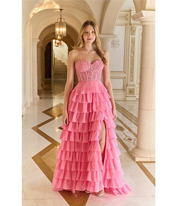 From Dear Moon, this dress features: Strapless sweetheart neckline Faux pearl appliqué corseted bodice Tiered skirt Zip and lace up back closure 62" length Polyester; lined Hand wash/line dry Imported.