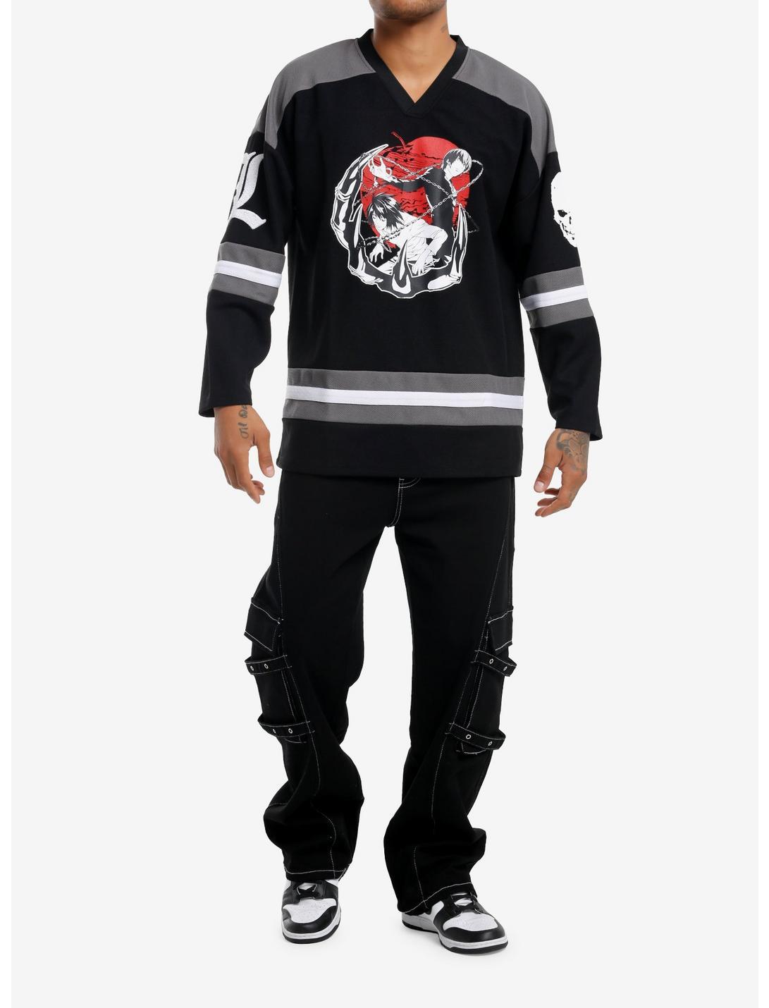 Get ready to outsmart your enemies in style with this Death Note hockey jersey! Featuring Light and L against a blood-red moon and their icons on the sleeves. Comes with grey and white stripe detailing and the rules of the Death Note on the back.100% polyesterWash cold; dry lowImportedListed in men's/unisex sizesModel is 6'1''Model wears size Medium