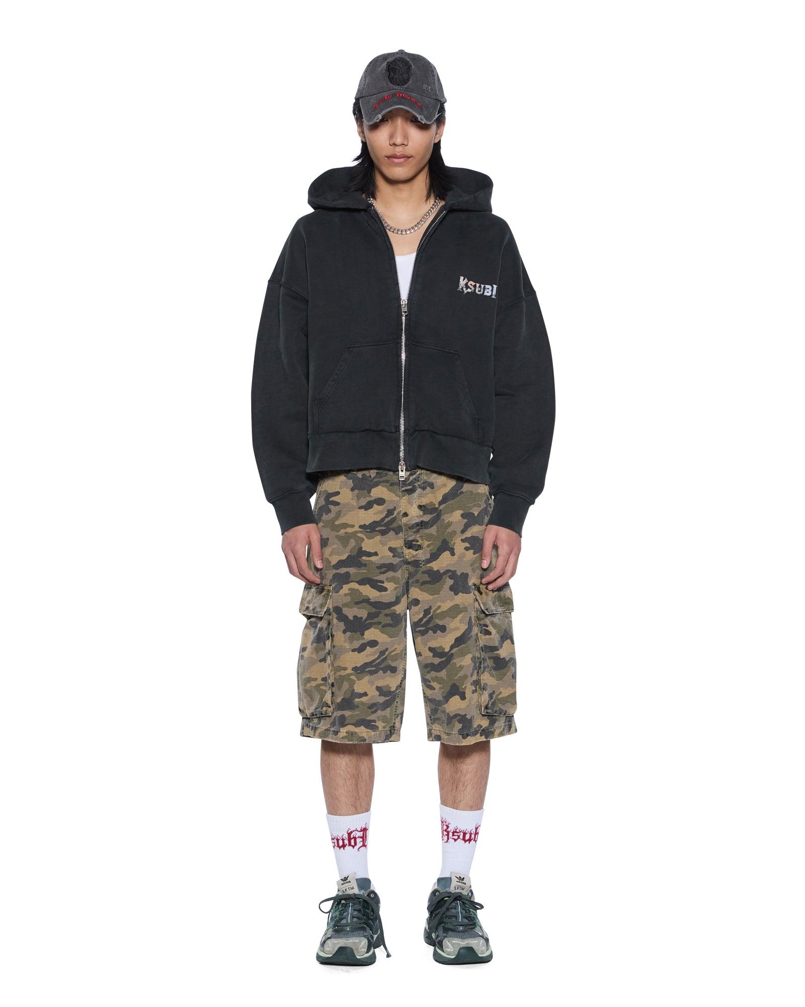 The Death Snake Halen Zip Hoodie Ash is a boxy, waist-length hoodie with a full zip front and twin zippers. Made from garment-dyed black loop-back fleece, it features front pockets, seasonal artwork on the front and back, and is finished with signature T-box and 4x4 detailing.