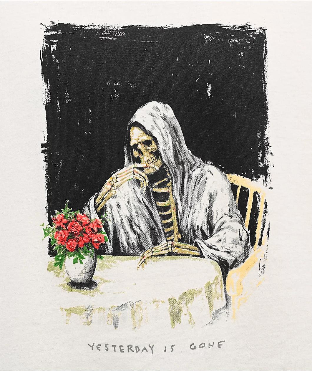 The minds at Deathwish Skateboards welcome the Yesterday Is Gone t-shirt in a natural colorway. Screen-printed on the front of the graphic tee is an eerie Grim Reaper sitting at a dining room table with a bouquet of flowers. A 100% cotton build ensu