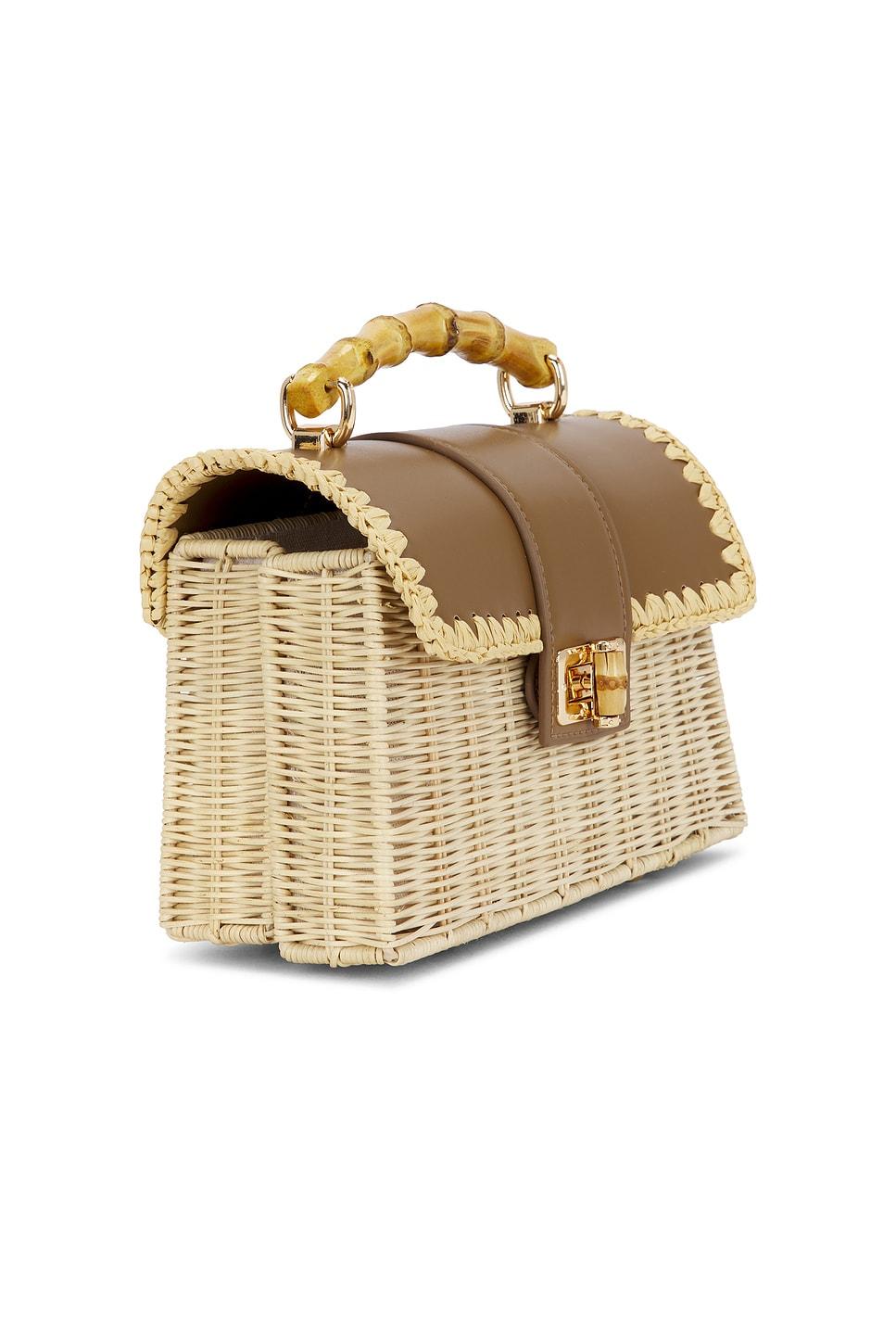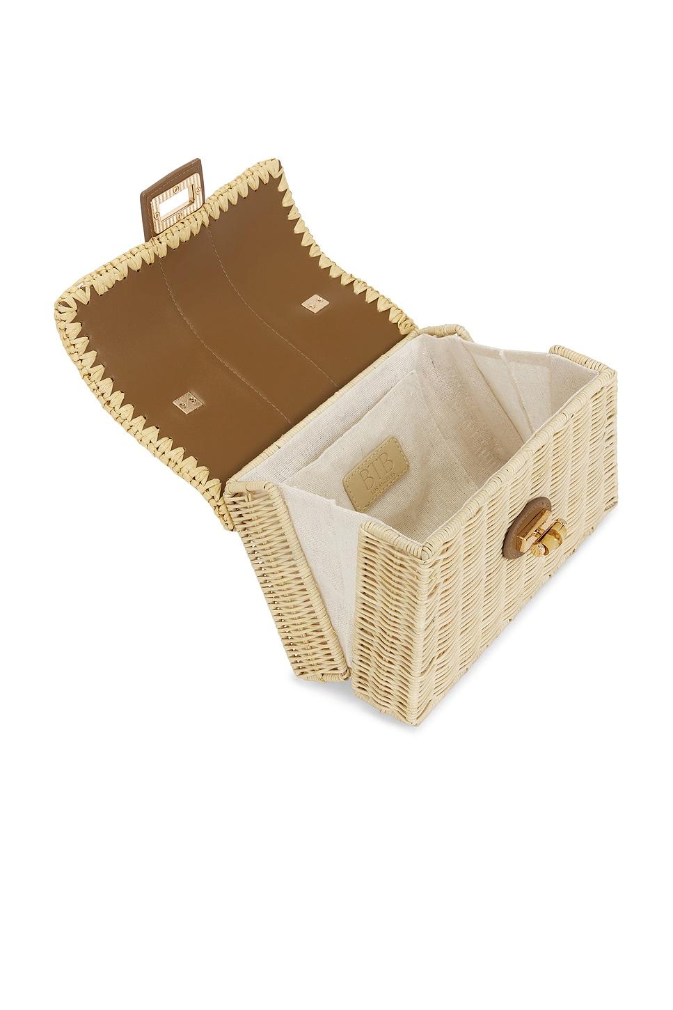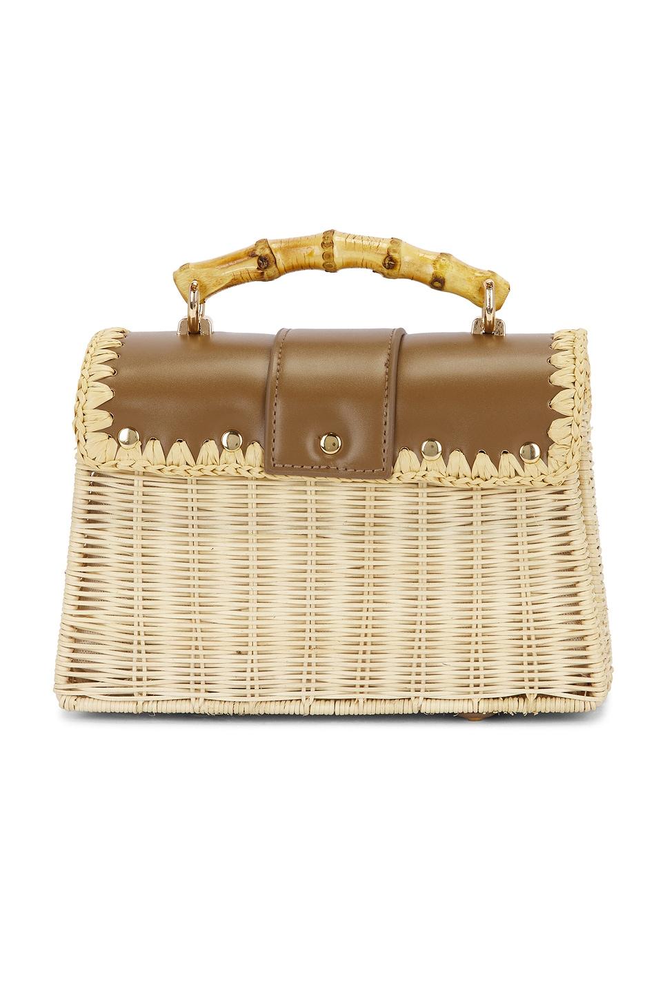 Rattan exterior with faux leather trim and textile lining. Flap top with bamboo style turn lock closure. One main compartment. Interior slip pockets. Bamboo style top handle. Detachable and adjustable faux leather shoulder strap. Measures approx 9" W x 5.5" H x 3.5" DShoulder strap with a 18" dropTop handle with a 1" drop. Made in China. Revolve Style No. BTBR-WY103. Manufacturer Style No. BG-SS25229.