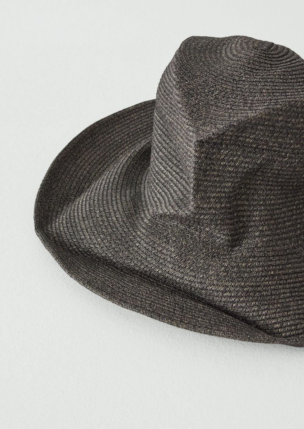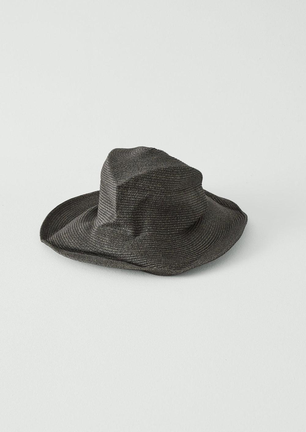 Hat featuring a unique wrinkled texture, made in Japan from a braided washi paper blend. The brim includes a wire for easy adjustment, with an inner band made from natural materials.