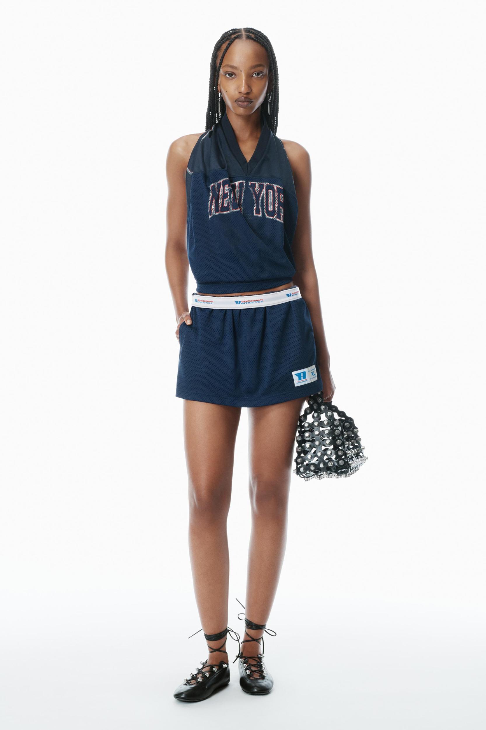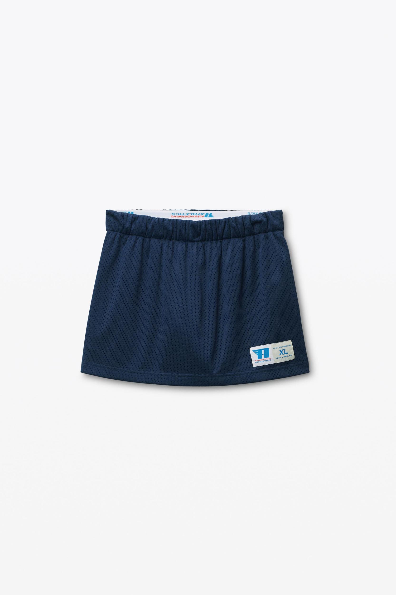 Inspired by a deconstructed basketball short, this navy mini skort reveals an exposed short and logo-detailed flip-down waistband. It is detailed with side seams and back patch pockets.