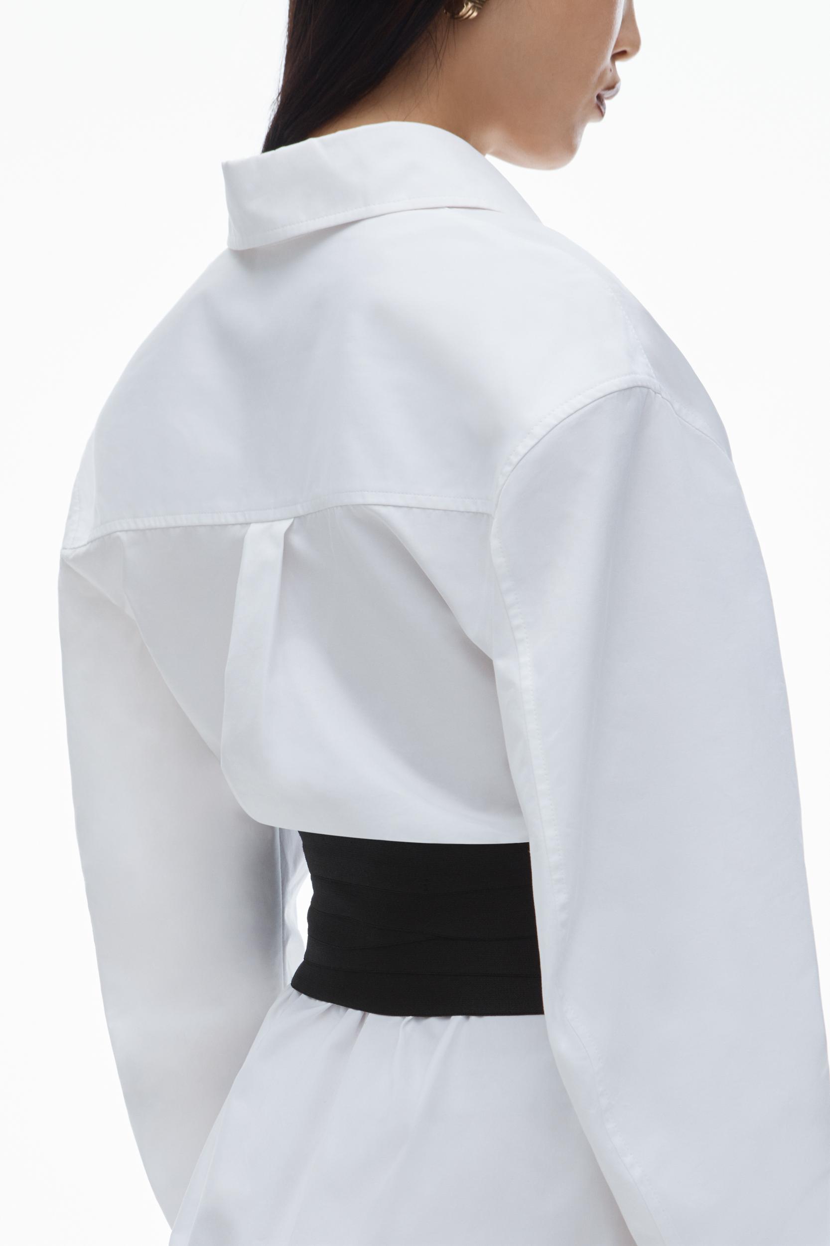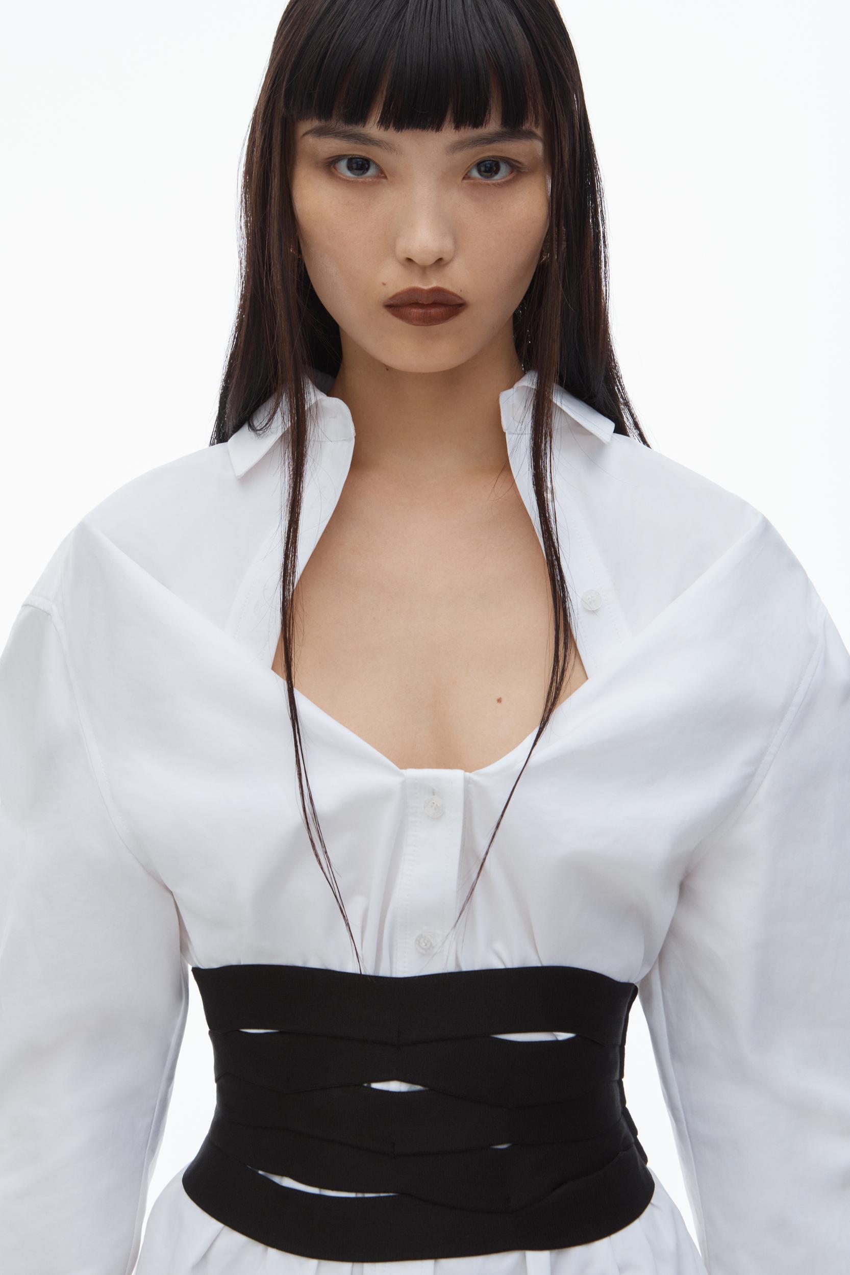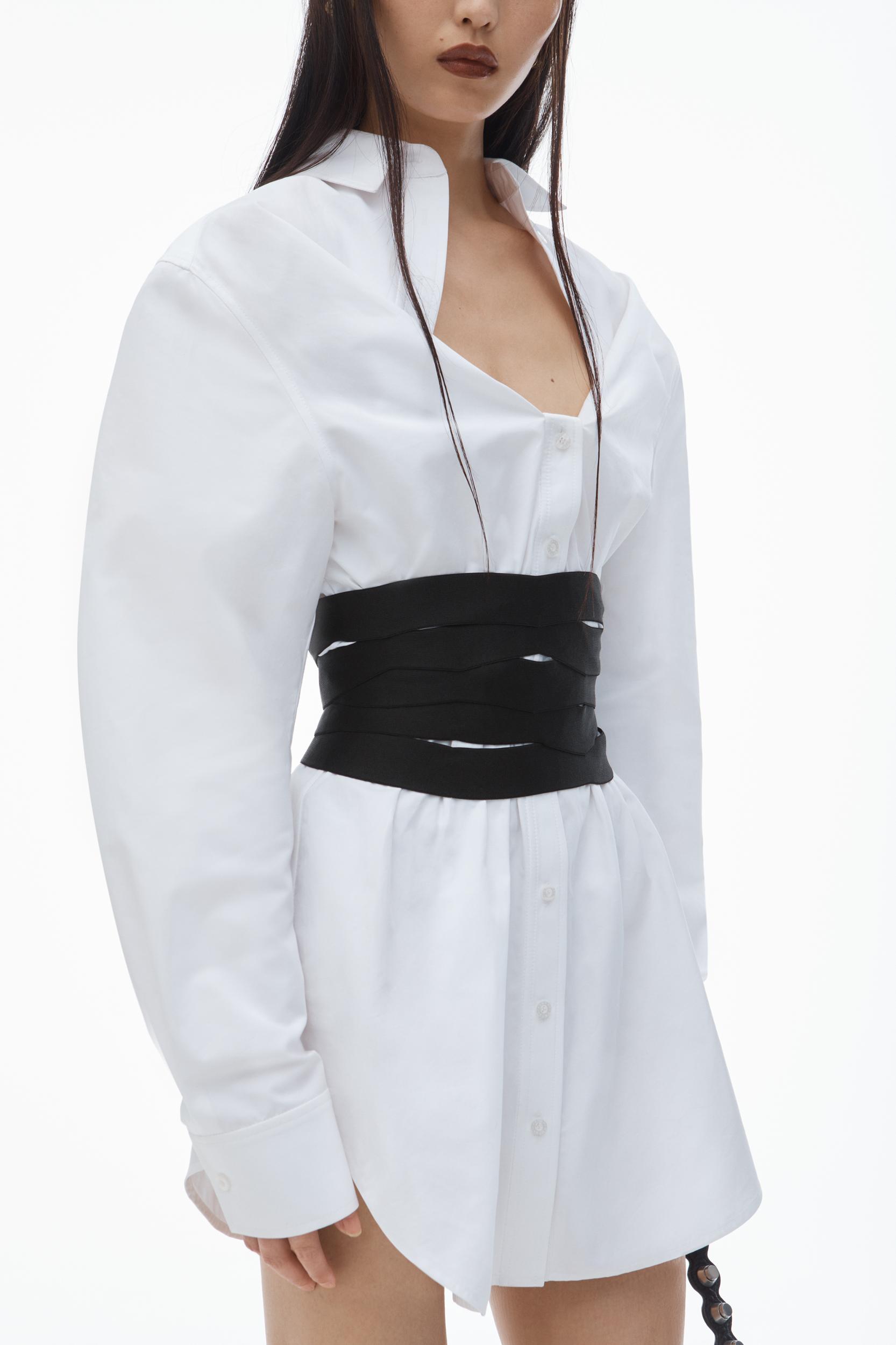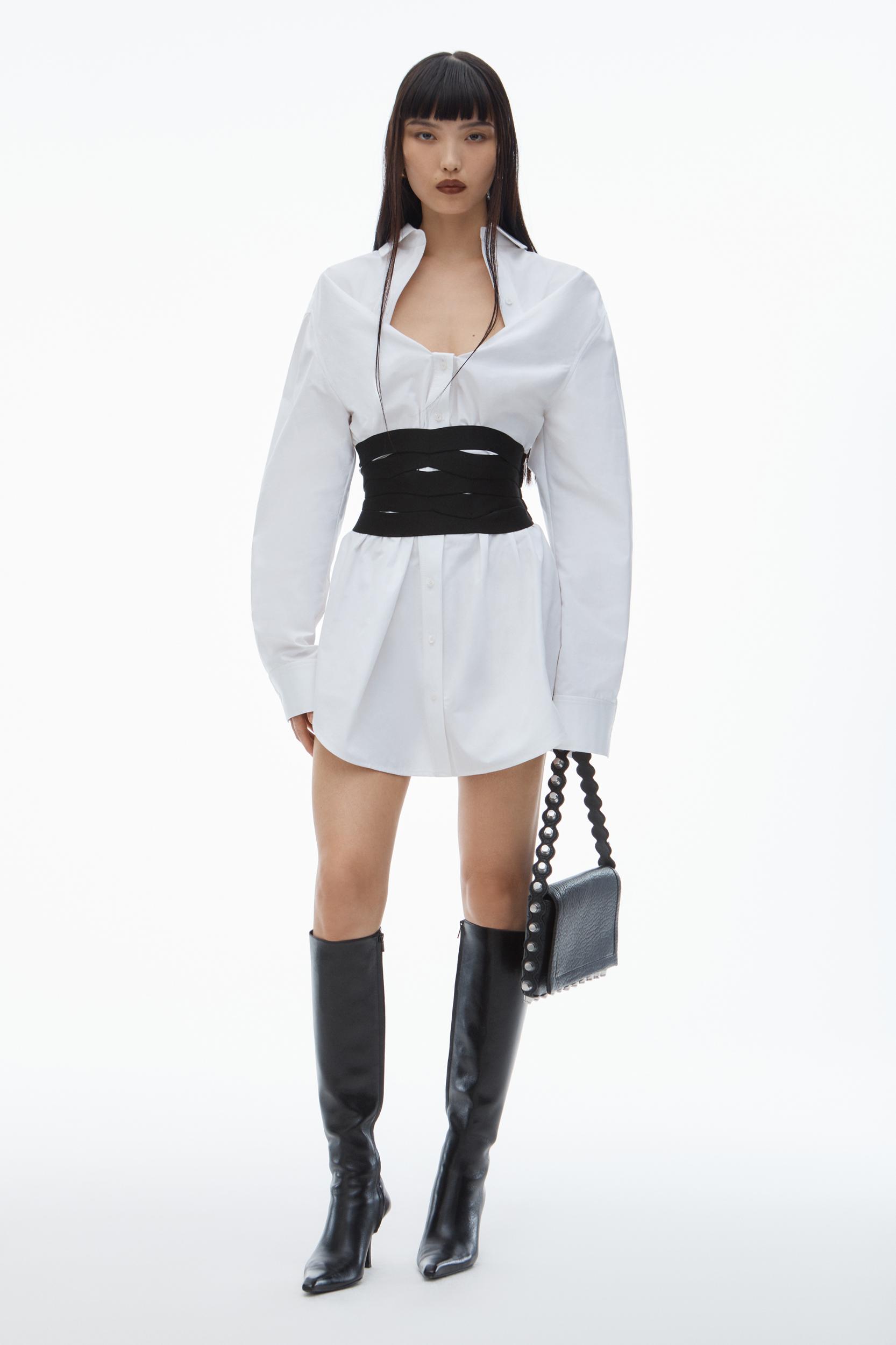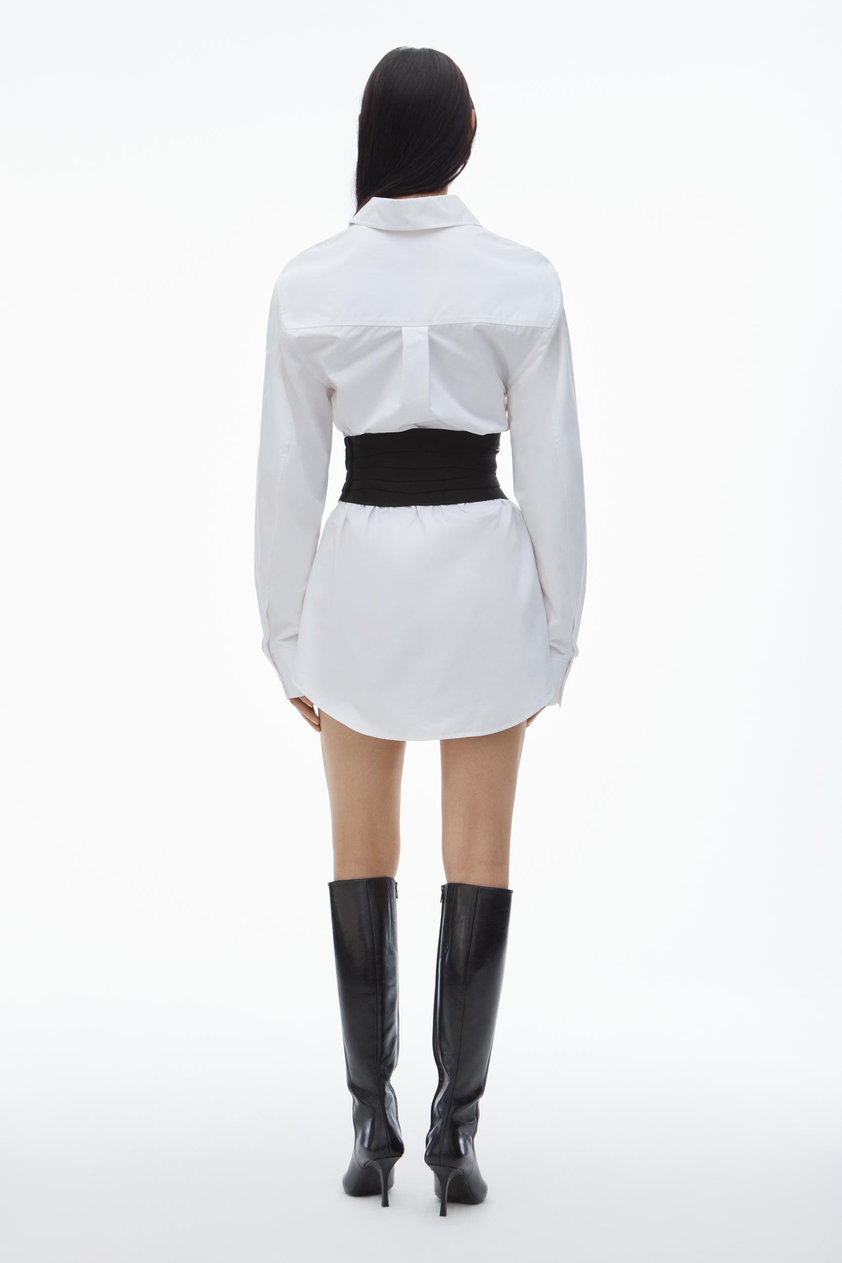 This deconstructed shirtdress in white features an elastic cummerbund waistband. A relaxed bust and fitted bodice accentuate this fit-and-flare silhouette, detailed with dimensional tuck-front detailing and a wide back seam.