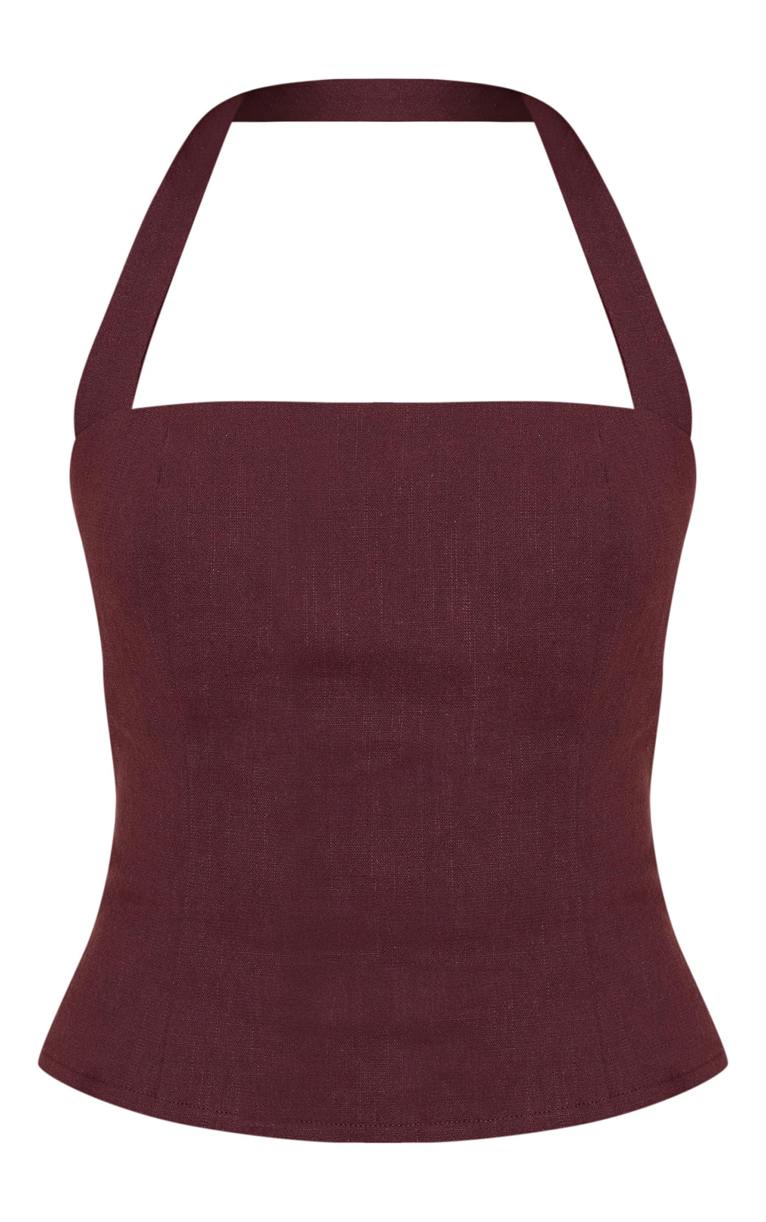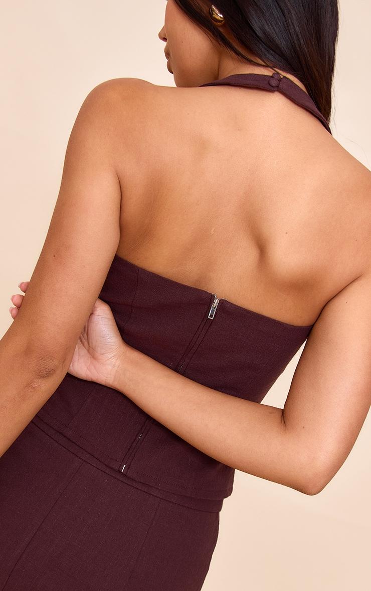 Let the shape do the talking. The deep chocolate premium linen halterneck top is defined by its strong, structured cut and clean square neckline, held in place by elegant halter straps. Fashioned from a linen-cotton blend, this piece maintains its sharp form, making it ideal for evening. Team it with the coordinating midi skirt for a complete two piece set moment, or pair with high-waisted black pants for a confidently chic alternative.Length approx 48.5cm/19inch (Based on sample size US 4)Model wears size UK 8/ EU 36/ AUS 8/ US 4Model Height - 5ft 9inchp]:!mb-4inch>Brand: PrettyLittleThingCategory: Co-ordsProduct type: Cami TopColor: Deep ChocolateDesign: PlainNeckline: HalterneckSleeves: SleevelessOccasion: Evening