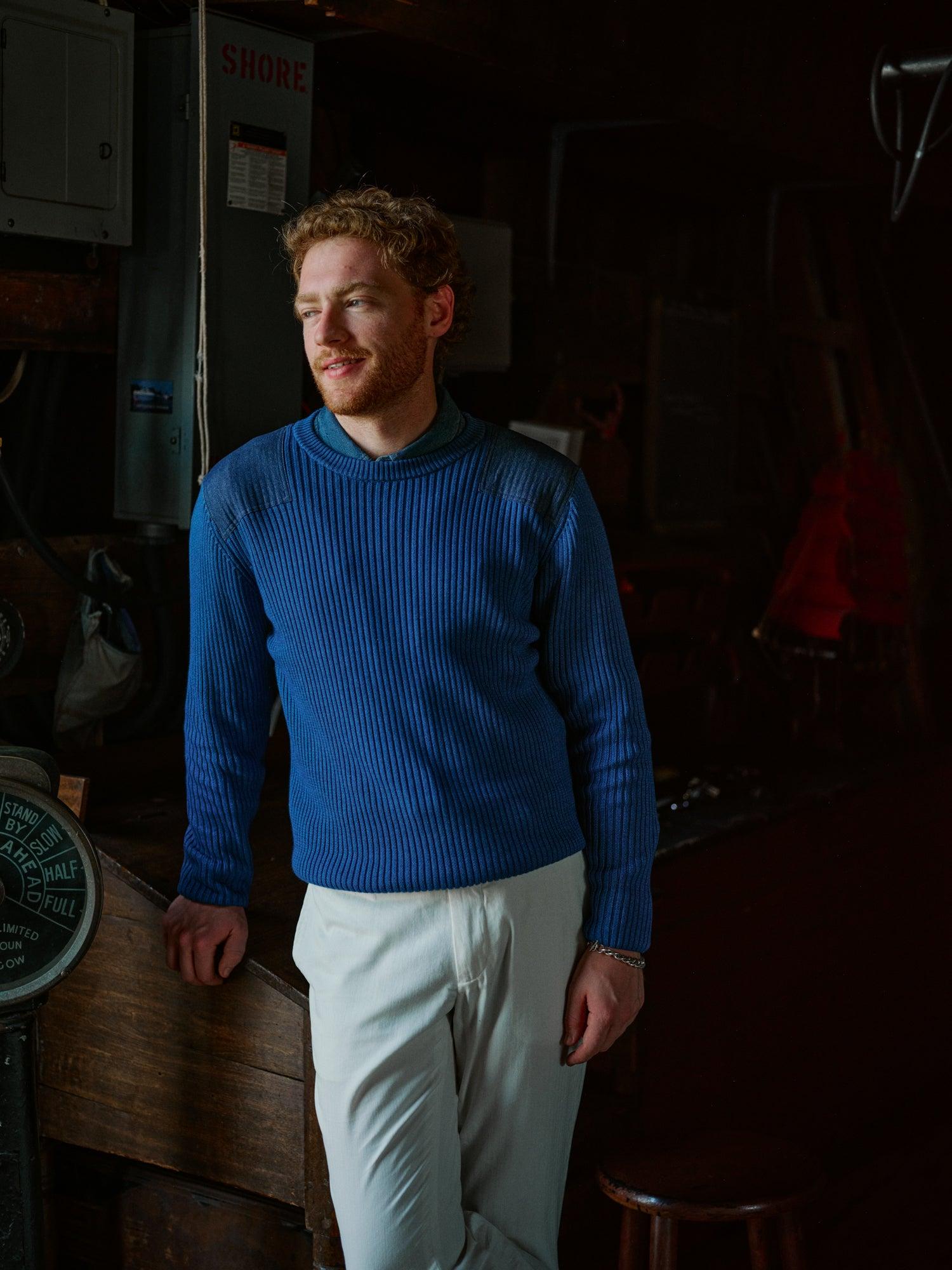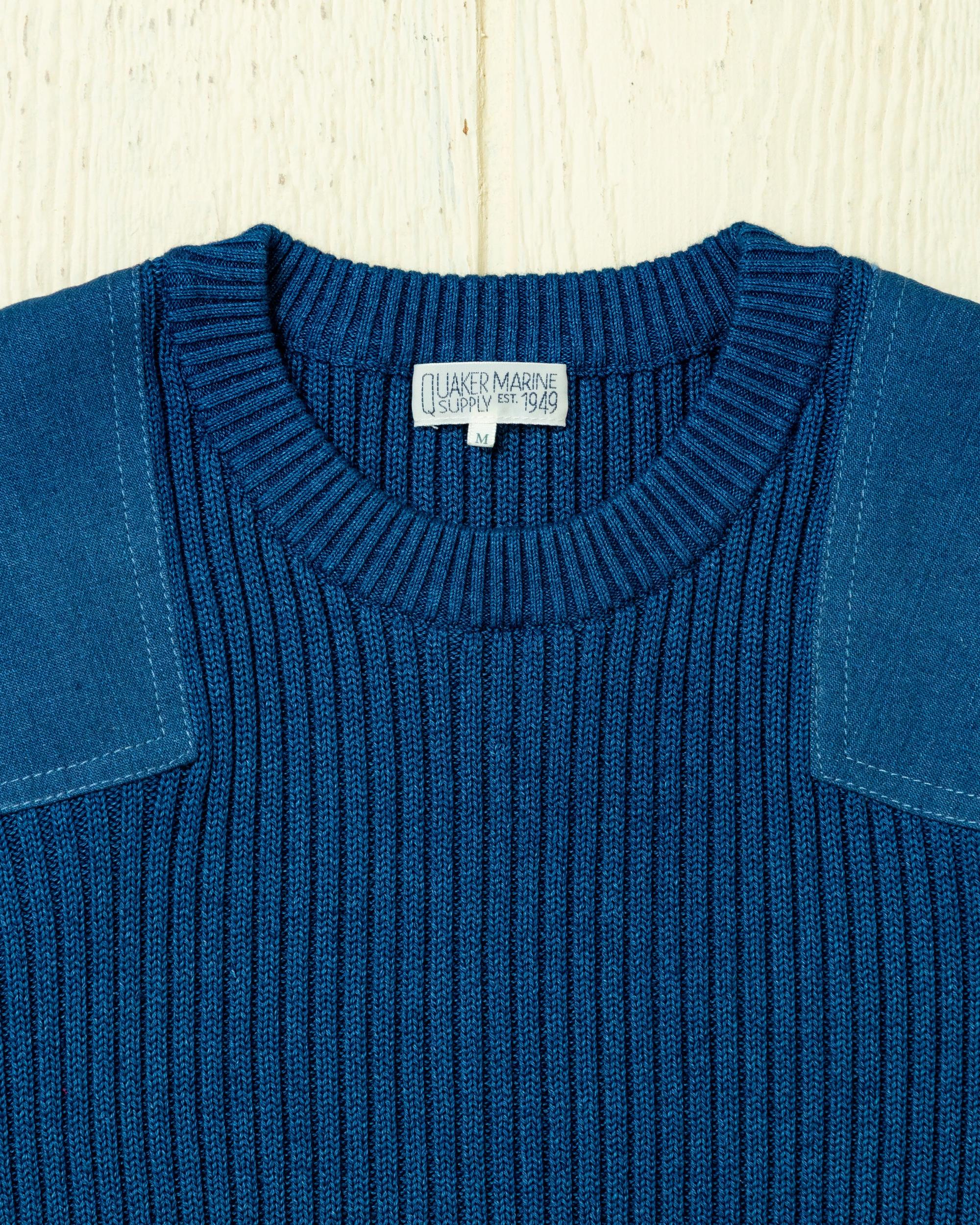 Our take on the perennial classic commando sweater is made in our signature Deep Sea indigo yarn with denim shoulder and elbow patches. A much more wearable alternative to the stiff, woolen original, this sweater will take on even more character with age.