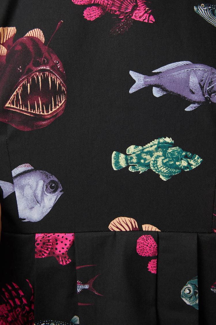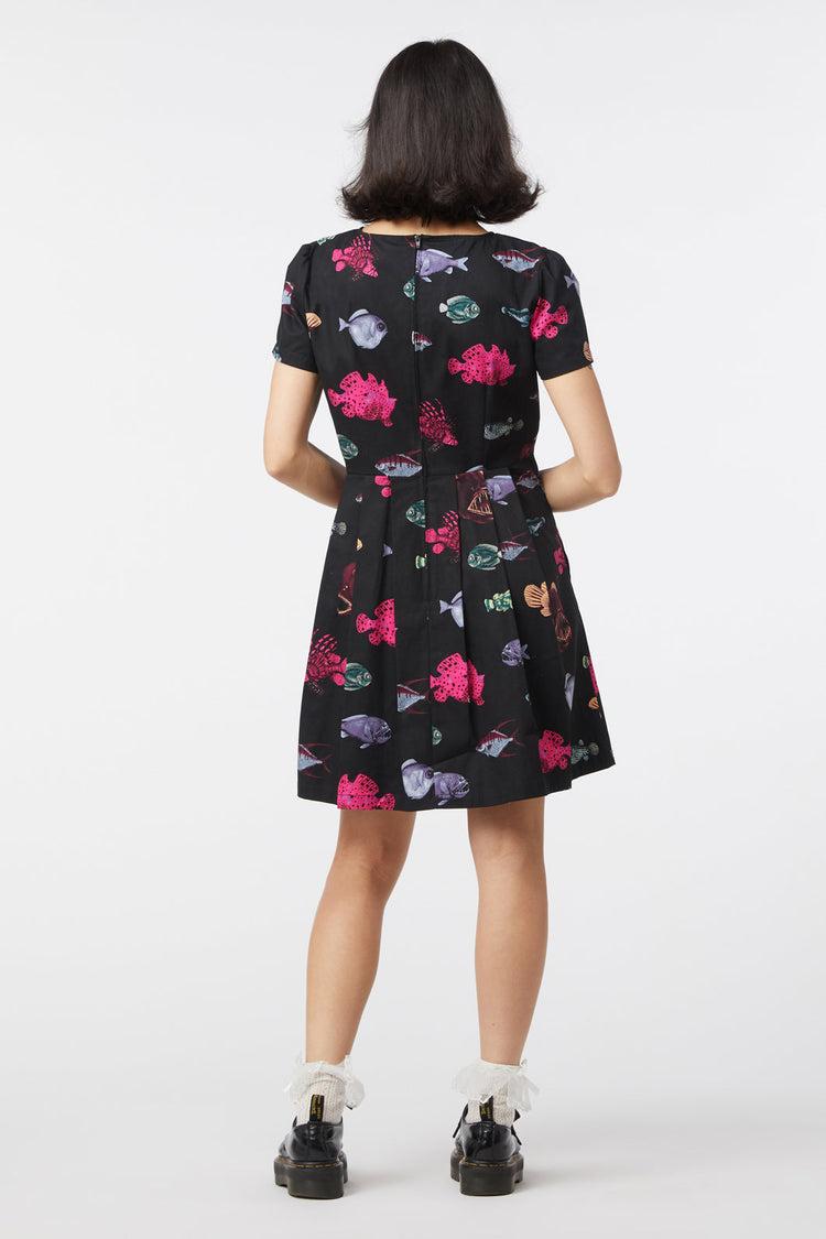 The Deep Sea Pleated Dress brings playful nautical detail to a classic silhouette. Featuring an all-over ‘Deep Sea’ print on black woven cotton, this style is designed with a round neckline, short sleeves, a fitted bodice, and a flared skirt gathered at the waist for soft movement and a relaxed fit.Fabric100% CottonCare InstructionsCold machine washDo not bleach or soakDo not wring or spinDo not tumble dryCool iron on reverse if required