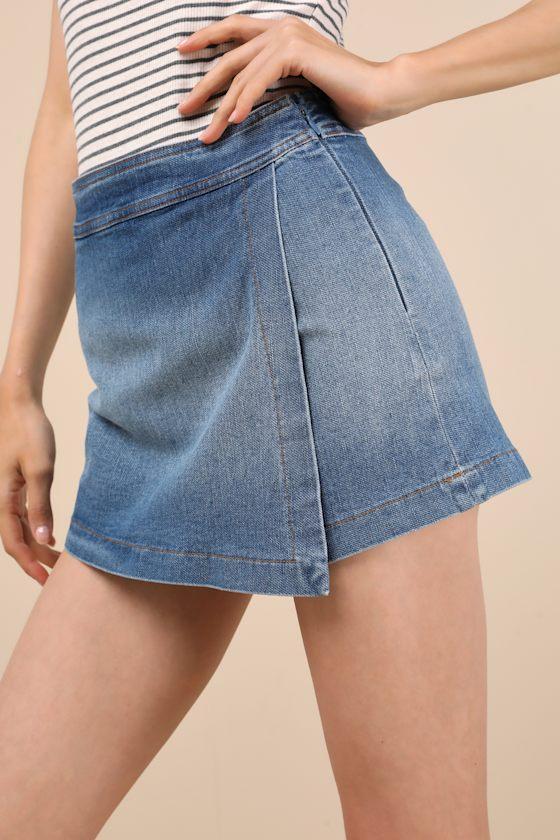 Everyone is going to adore a look like the Lulus Definite Perfection Medium Wash Denim Faux Wrap Skort, that exudes effortlessly cute energy! This trendy skort has a cotton denim construction that shapes a high-rise fit and a banded waist. Fitted shorts feature an overlapping skort panel at the front that creates a subtle asymmetrical, mini hem. Hidden side zipper/clasp.