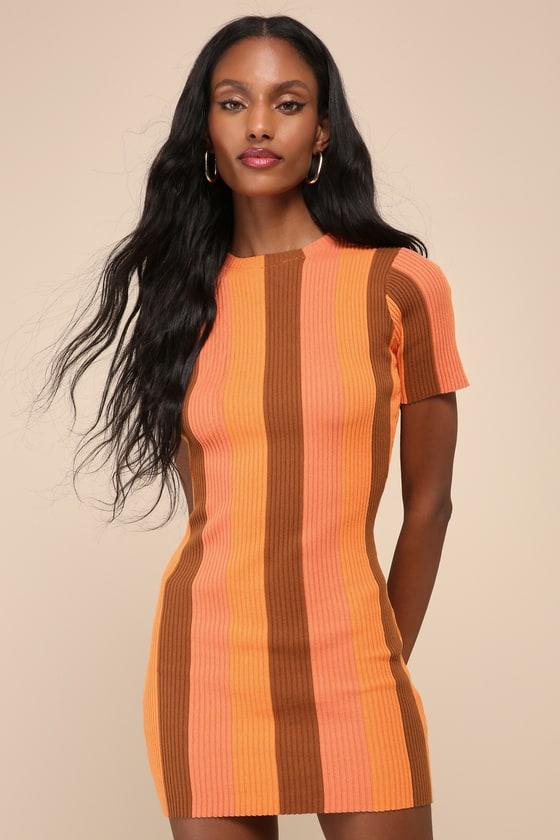 Channel effortlessly groovy vibes in the Lulus Definitely Cool Orange Striped Ribbed Short Sleeve Mini Dress! Stretchy ribbed knit (with a trendy striped design in hues of orange, terracotta, and brown) shapes a classic crew neckline and a fitted bodice, framed by short sleeves. Bodycon silhouette hugs your curves just right before ending at a cute mini hem.