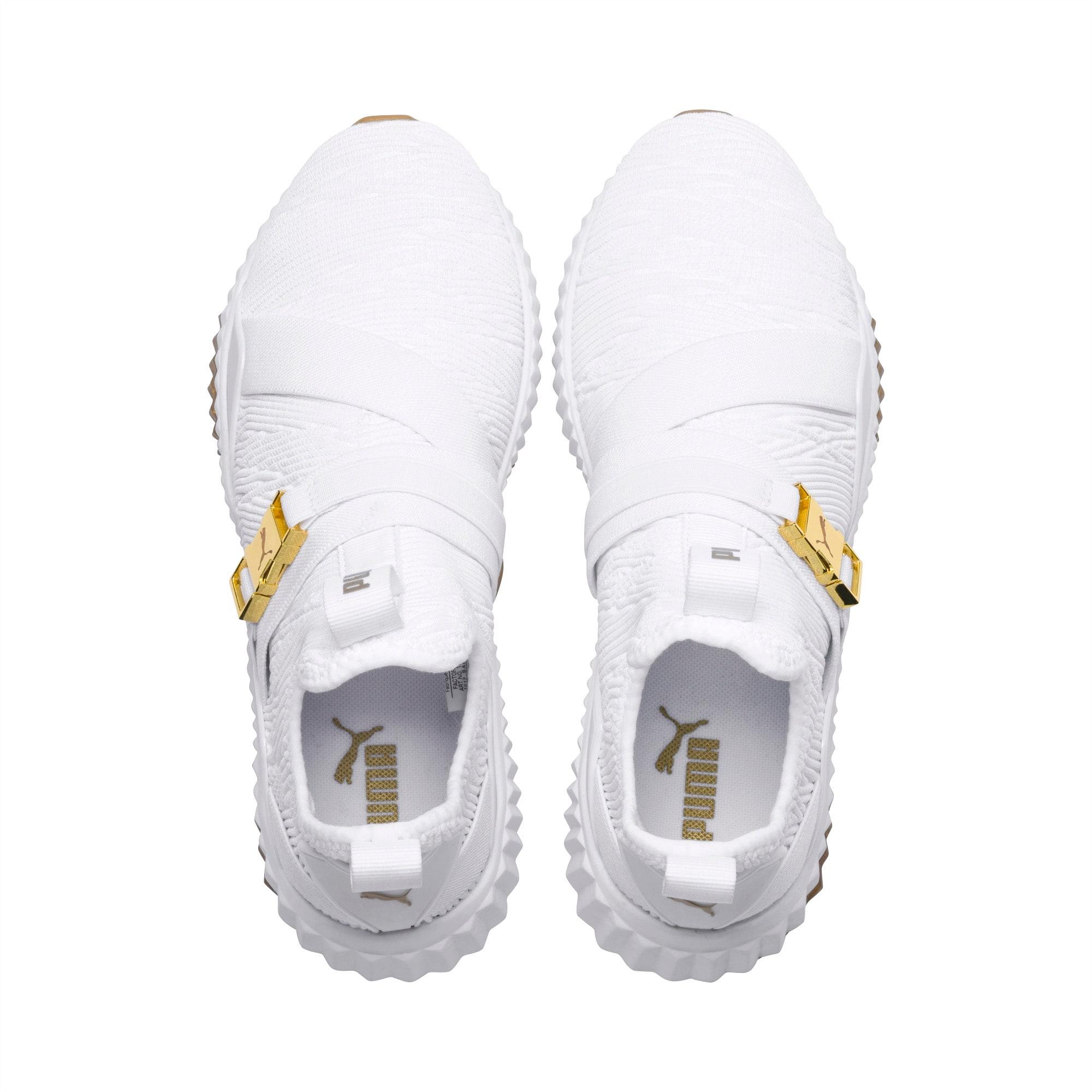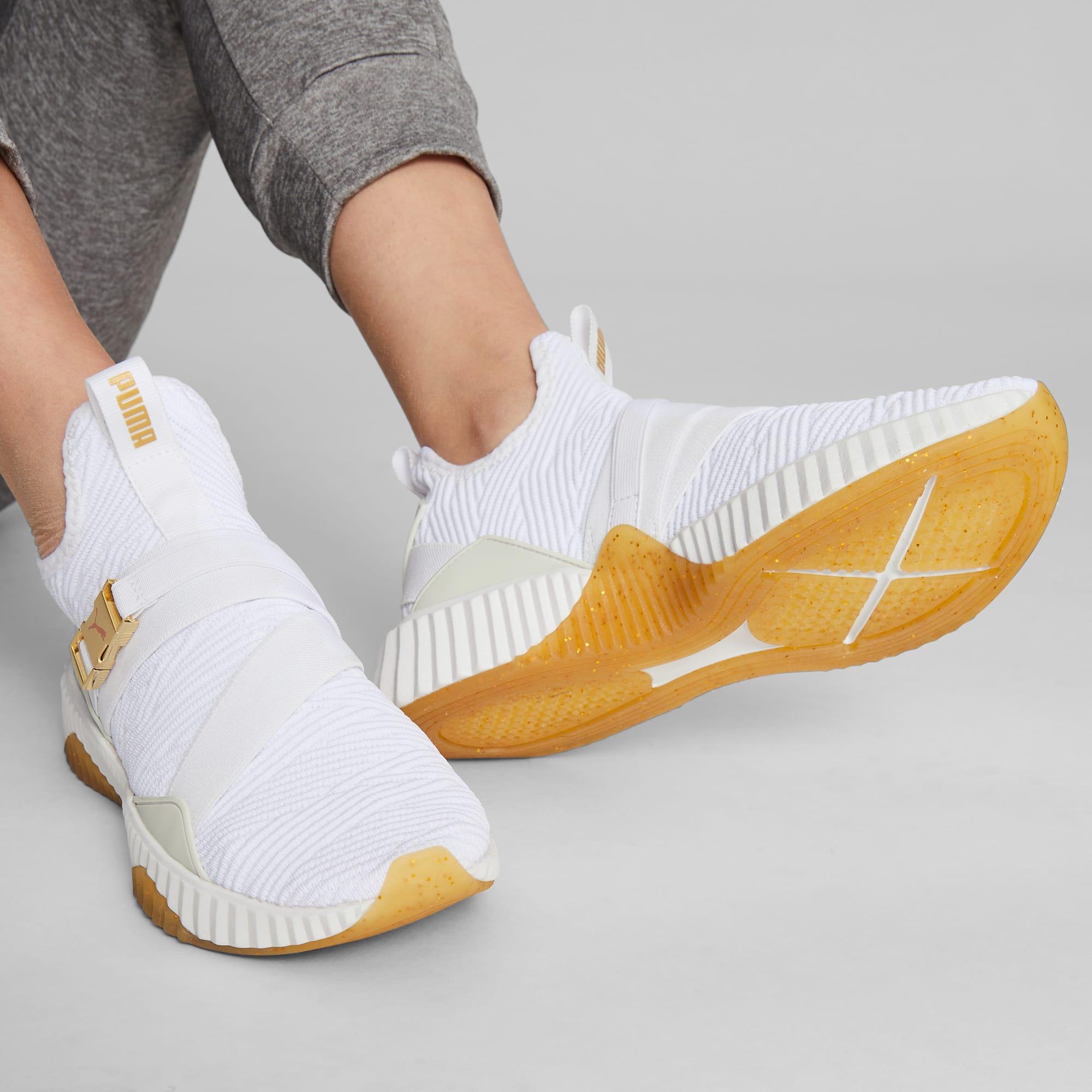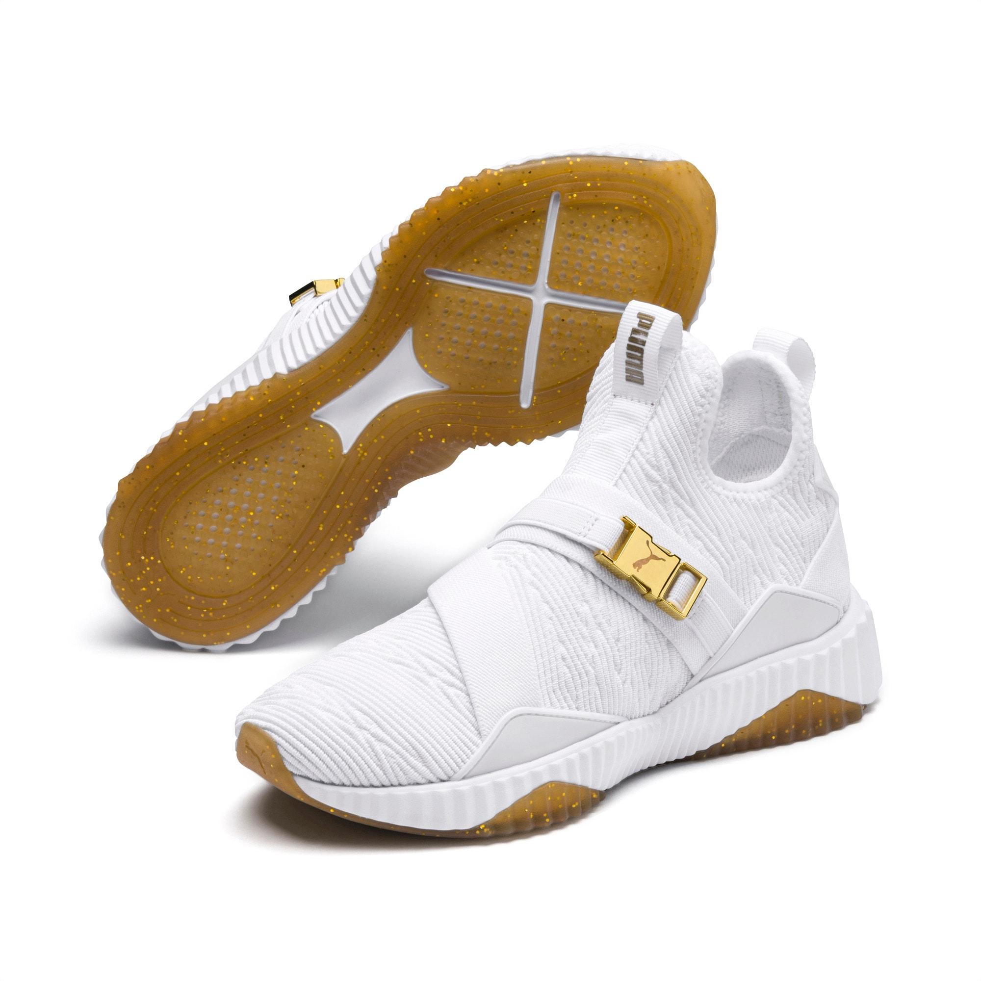 With a form-fitting textile upper, sleek monochromatic lines, a sparkly outsole and gold hardware, the Defy Mid Varsity has an elegant silhouette that’s as ready for the gym as it is for the streets. A feather-light, high-rebound midsole provides superior energy return, cushioning and comfort, while its slip-on bootie construction gives a sock-like feel. You won’t want to leave home in anything else.Mid height silhouetteTextile upper with strategically placed thermoplastic polyurethane pieces for added supportVamp and collar straps for a sporty, elegant flairHigh-rebound foam midsoleRubber outsole with traction points to support multi-directional movement