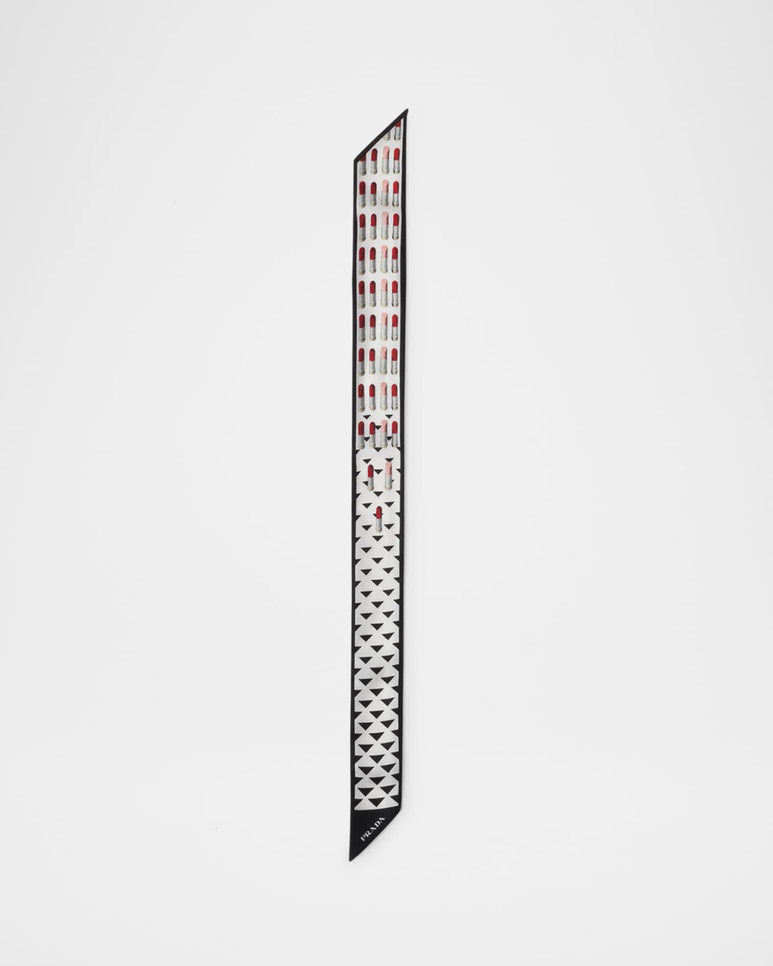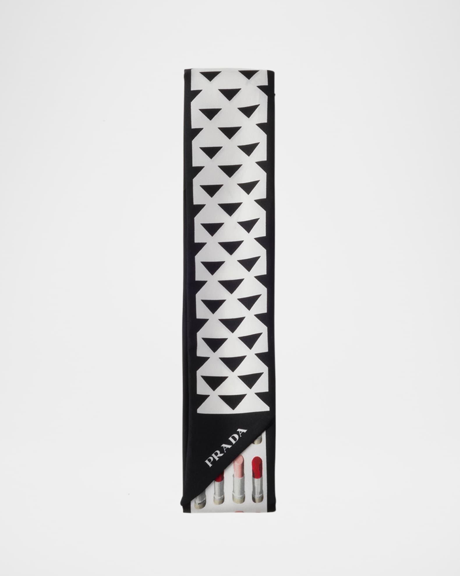 Prada skinny scarf in silk twill is decorated with the Degradé triangle print on one end and lipstick symbol print on the other. May be styled in multiple ways Logo script printed on one edge Angled ends Approx. 33.5"L x 2.4"W Silk twill Hand wash Professional cleaning recommended Imported