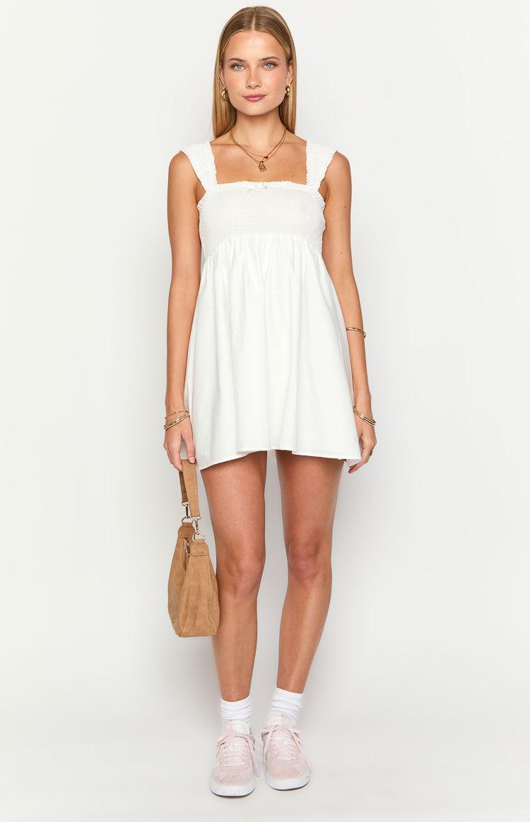 White Cap Sleeve Babydoll Mini DressHow to style:Radiate sweet, sun-soaked charm in our Dekoda White Cap Sleeve Mini Dress. With its breezy babydoll silhouette and delicate bow detail, this lightweight style is made for summer adventures. Complete the look with strappy sandals, a tote, and soft waves for a dreamy daytime outfit perfect for picnics, markets, or a relaxed weekend brunch. Features: Mini length Lightweight cotton material Fully lined Shirred bust panel and straps Babydoll style Front mini satin bow Pull-on style Perfect for sunny days out and casual weekends!