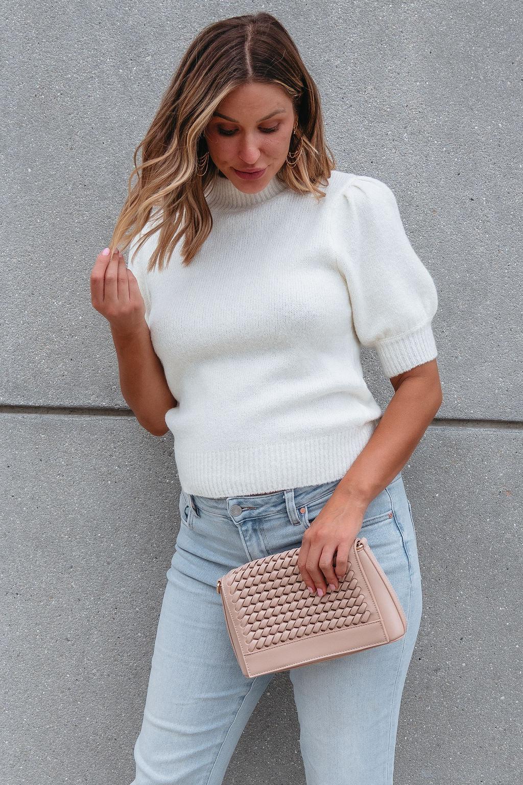 The Delaney Sweater brings elevated ease to your fall wardrobe. Made from a soft, cozy knit with ribbed texture, it features chic short puff sleeves and a timeless mock neckline. Its gently structured silhouette makes it ideal for layering or wearing solo. Pair it with trousers, denim, or midi skirts for a polished, feminine look that transitions seamlessly from desk to dinner.