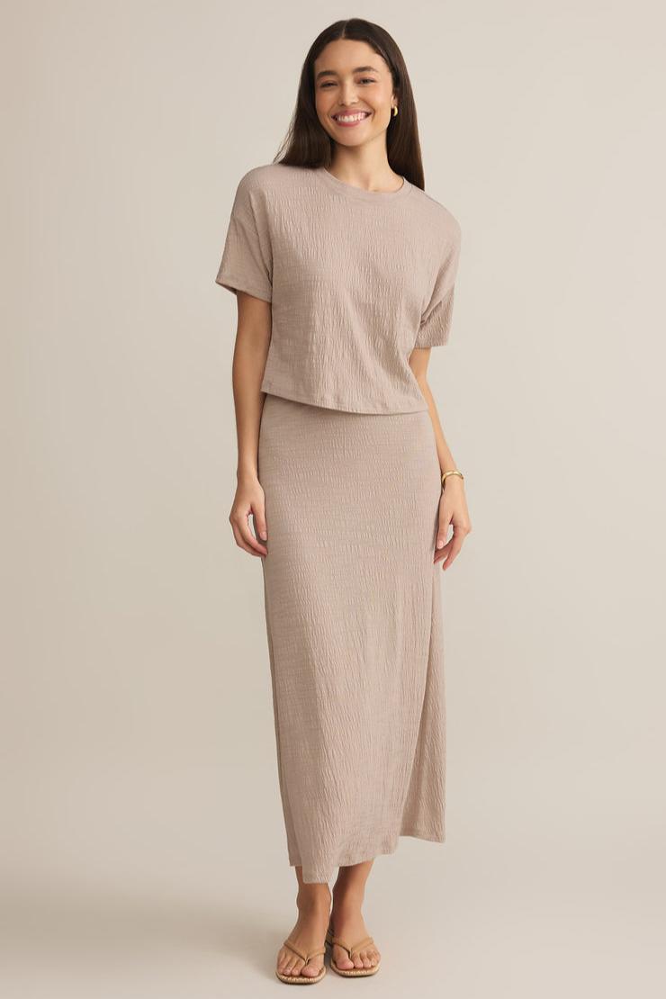Relaxed and versatile, this mid-rise maxi skirt features an elastic waistband and textured slub knit fabric for a laid-back vibe. Midweight and easy to style, it’s the ultimate piece for effortless layering.