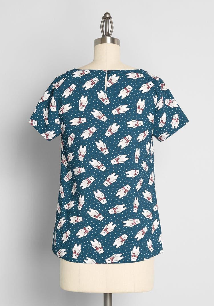 We couldn't think of a more perfect pair to your pleasant personality than this silky crepe blouse from our ModCloth namesake label! Featuring an exclusive, holiday print atop a navy blue background with red-and-white stripe scarf-wearing polar bears and white speckled dots scattered all over, you will be donning festive, winter style. The short sleeves and back keyhole of this lightweight top instantly put a jolly smile on your face.Polyester.Machine wash. Back button closure.Imported Fabric provides stretch. S=24 inches Length 1X=26 inches Length