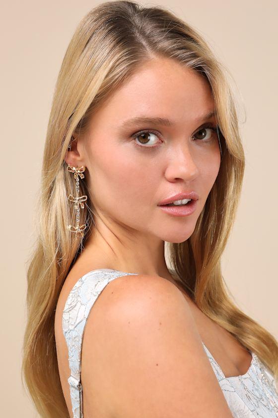 Charm your way through every event with the help of the Lulus Delightful Glimmer Gold Bow Drop Earrings! These darling earrings have a drop-style silhouette, with long strands of glittering rhinestones interspersed with textured bow charms throughout.
