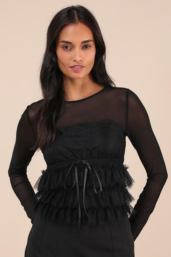 From first dates to friend dates, you'll always look incredible in the Lulus Delightful Impact Black Mesh Lace Drawstring Long Sleeve Top! Stretchy, lightweight mesh shapes long sleeves and a sheer décolletage that tops a lace bodice with a functional ribbon drawstring at the waist. Tiered and ruffled lace cascades to a lightly cropped hem.