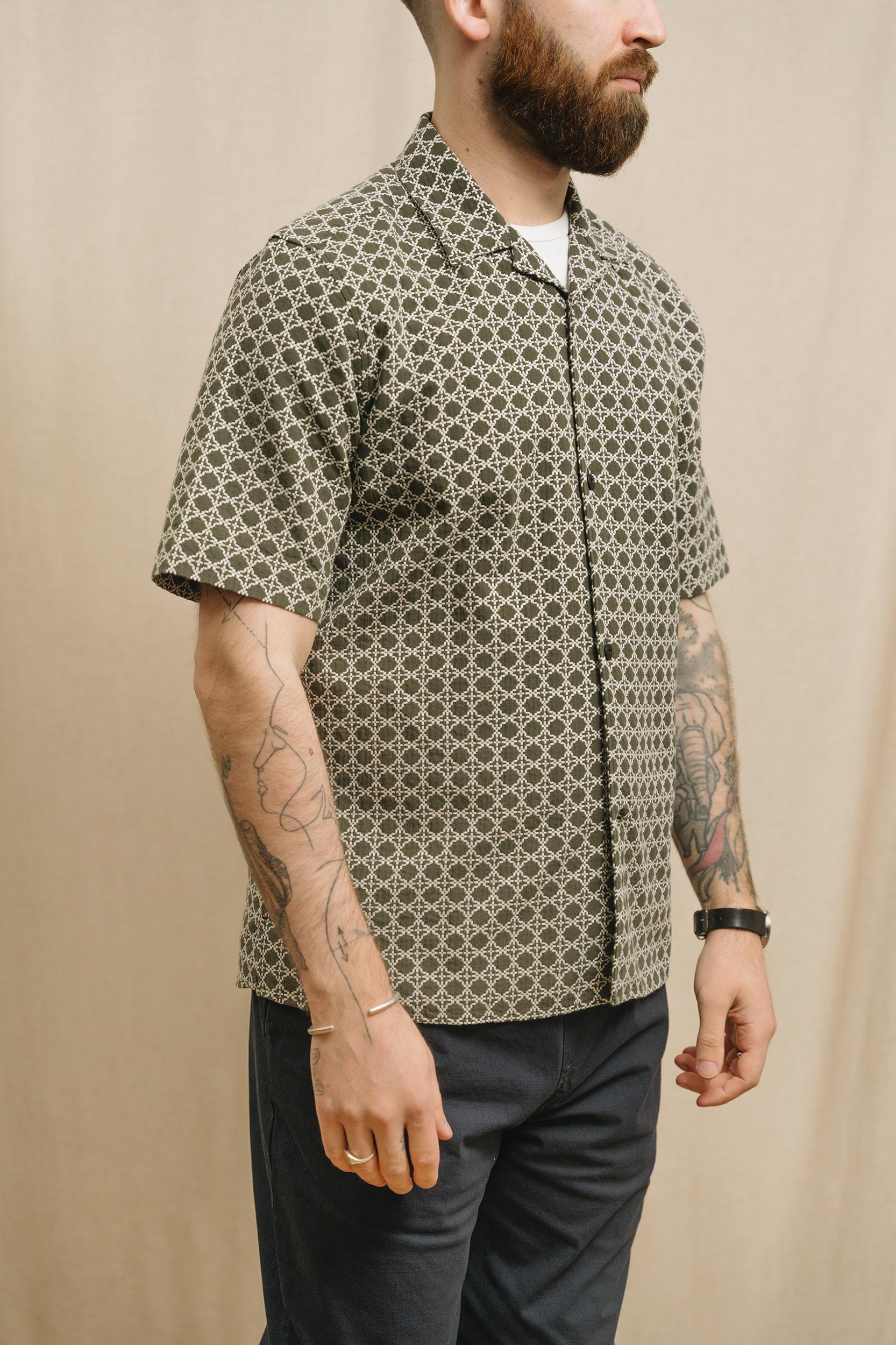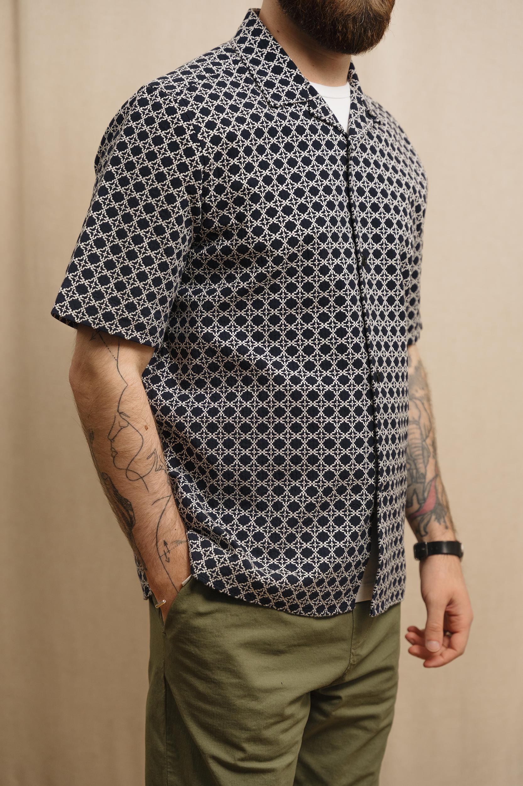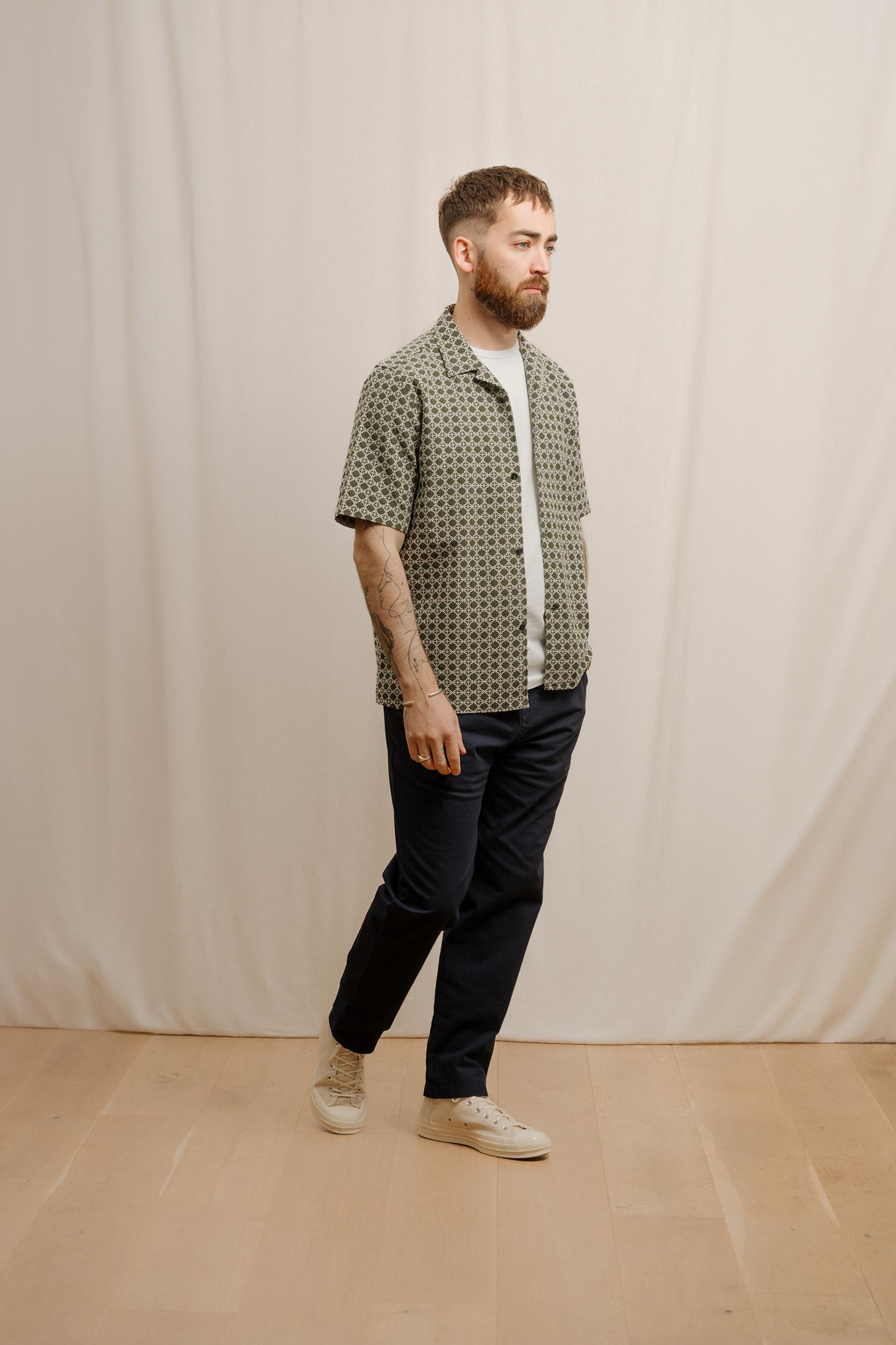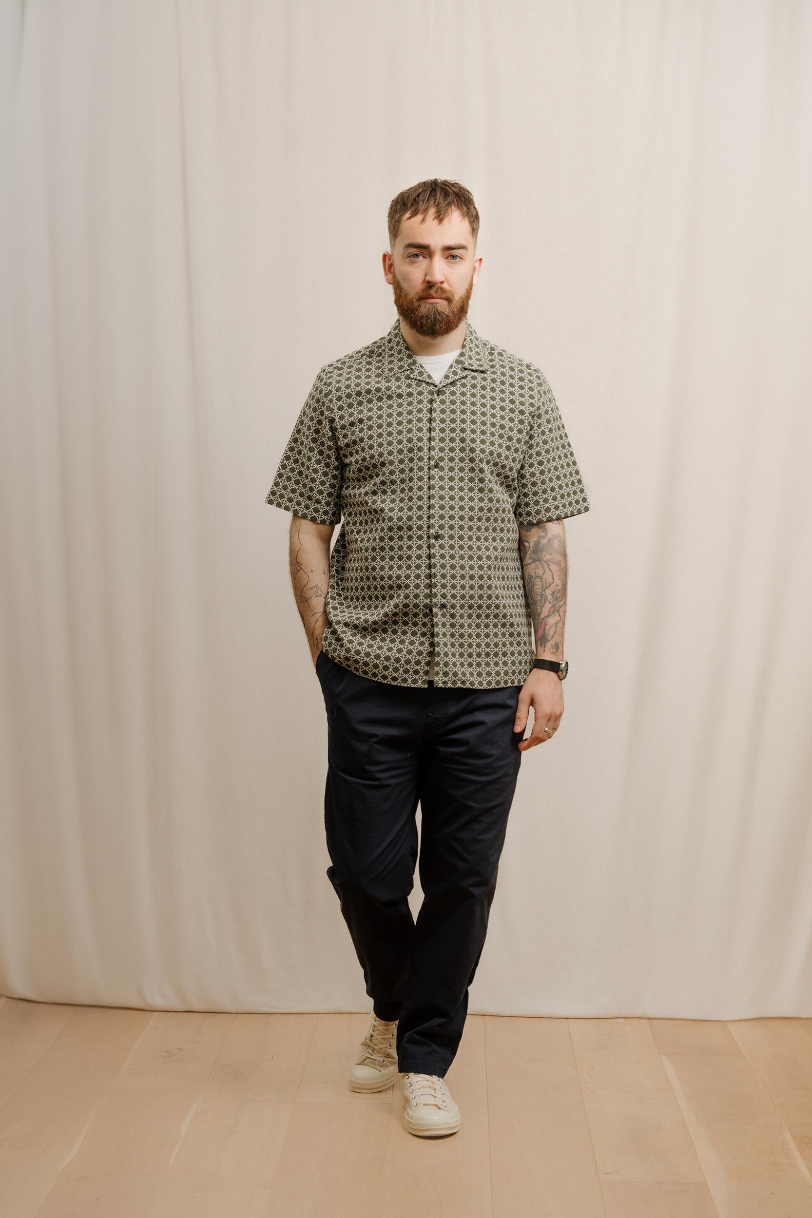 The Short Sleeve Cabin Shirt is a relaxed style, cut in a shape that is straight through the body. Crafted from a beautiful, mid-weight jacquard design from Portugal. Detailed with a camp collar and finished with sustainable, corozo nut buttons. Cut for a regular fit. Take you normal size.