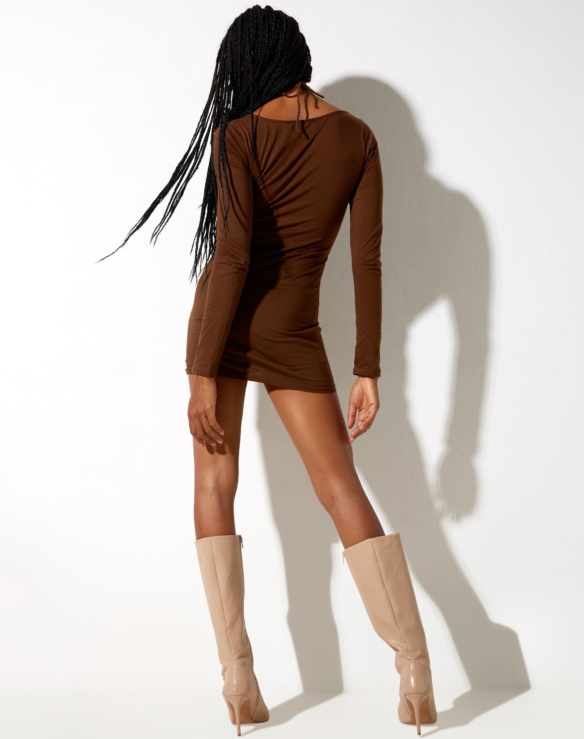 Keep your weekend 'fits updated with the Delray dress. In a brown cocoa hue it features a bodycon mini fit, square neckline, long sleeves, cutout detailing to the front and cross over halterneck straps. For your next night out pair with a knee high boot. MODEL WEARS:XS - MODEL HEIGHT:5'8