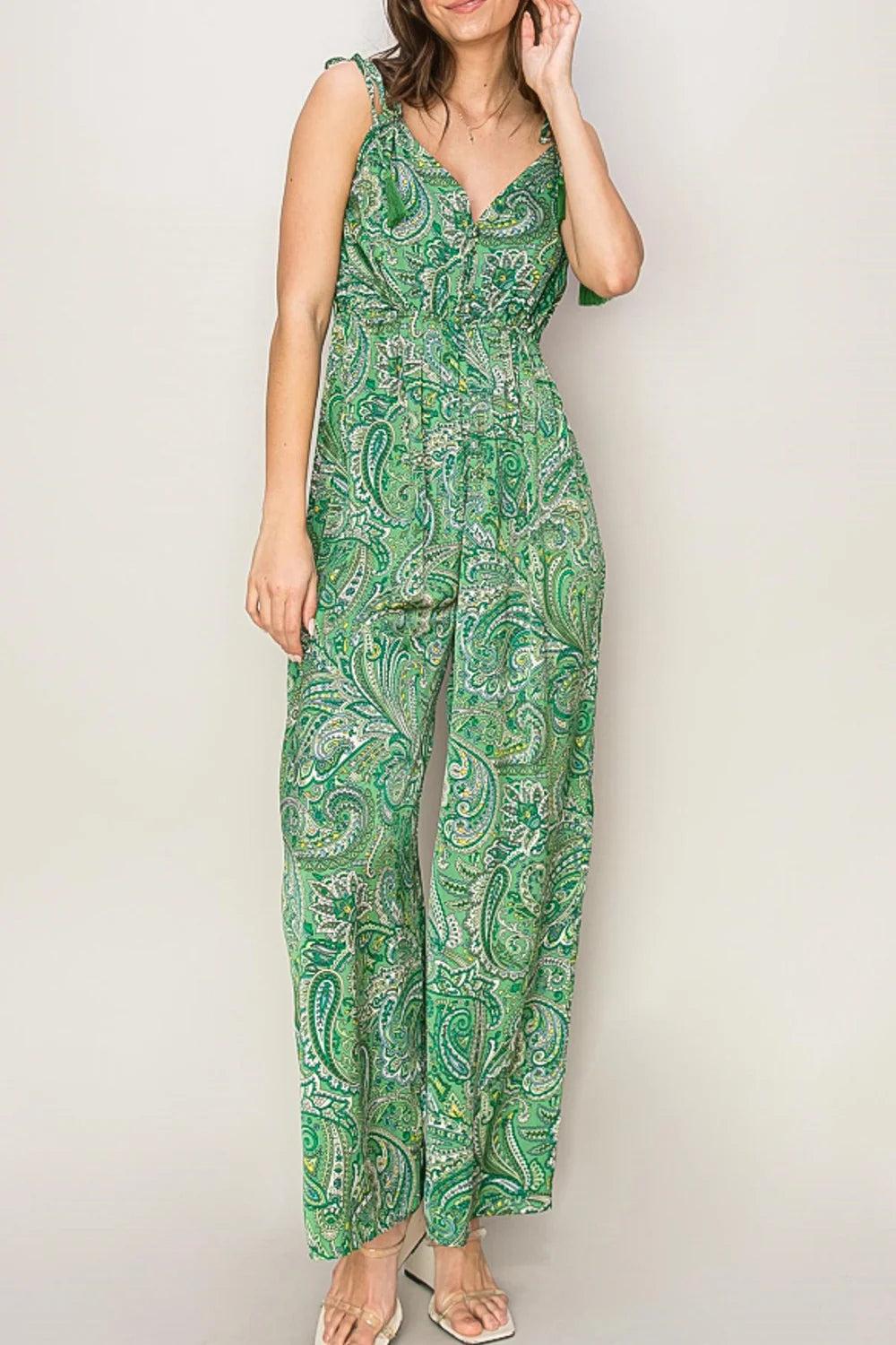 Unleash your inner fashionista with this chic jumpsuit in a luxurious satin fabric, featuring charming front buttons and quirky tassel details on the shoulder straps. The wide-leg silhouette flatters your figure and can be dressed up or down, making it a versatile choice for any occasion. Amp up your style with layered pendant necklaces and summery sandals, unleash your bohemian side with a fringed kimono and ankle boots, or easily transition from day to night with bold gold earrings, heels, and a trendy braided clutch. Embrace the softness and breathability of the fabric, the V-neckline, sleeveless design, playful paisley print, and effortless maintenance.