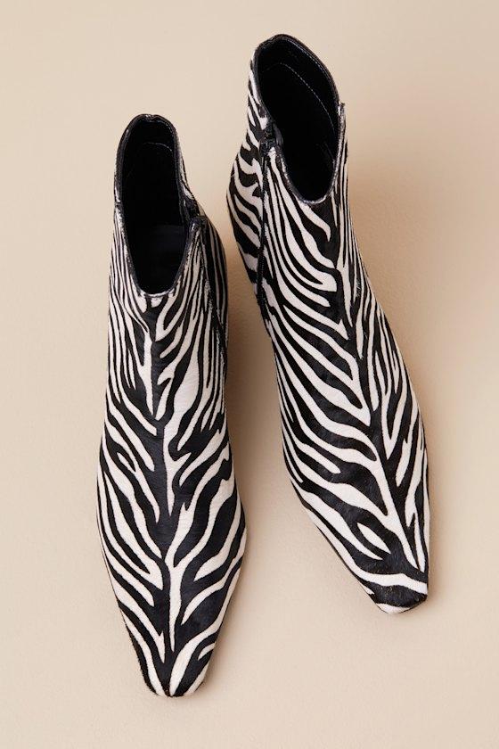 Throwback-chic meets modern perfection in the Steve Madden Delvie-A Zebra Calf Hair Pointed-Toe Ankle Boots! Sleek, genuine calf hair (with a black and white zebra print throughout) shapes these fun booties with a pointed-toe upper that rises to an ankle-high shaft. A 6.5" zipper at the instep makes for effortless on-and-off, while a low blade heel completes the look!