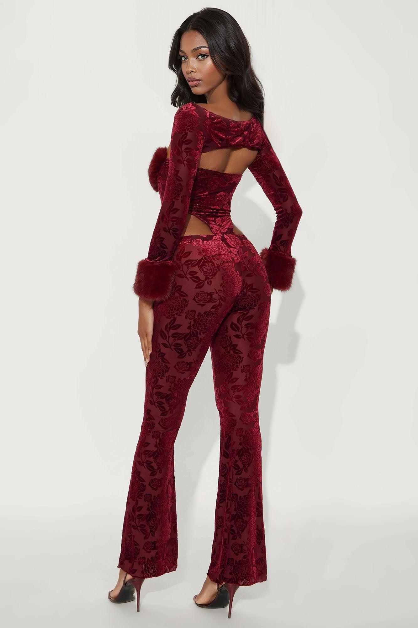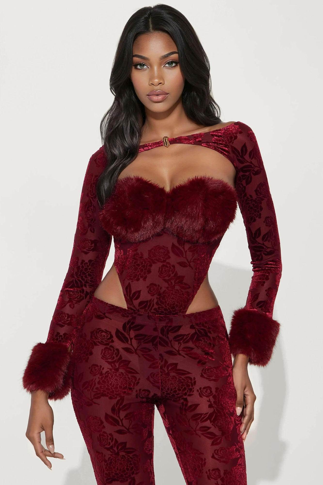 Available In Burgundy. 3 Piece Ensemble Bolero, Bodysuit And Pant Set Stretch Faux Fur Detail Elastic Waistband Straight Leg 34" Inseam Self: 70% Polyester 20% Nylon 10% Spandex Contrast: 100% Polyester Lining: 100% Polyester Imported California Proposition 65WARNING: Cancer and Reproductive Harm - www.P65Warnings.ca.gov.