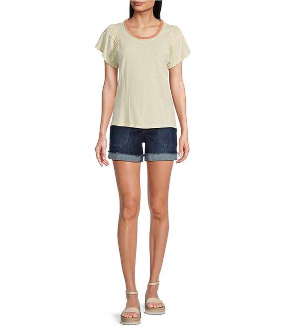 From Democracy, these shorts feature: Stretch denim fabrication High-rise Belt loops Front patch pockets Rolled-cuff hem Button and zipper fly closure Approx. 4.5" inseam Cotton/repreve® recycled polyester/spandex Machine wash/tumble dry Imported.