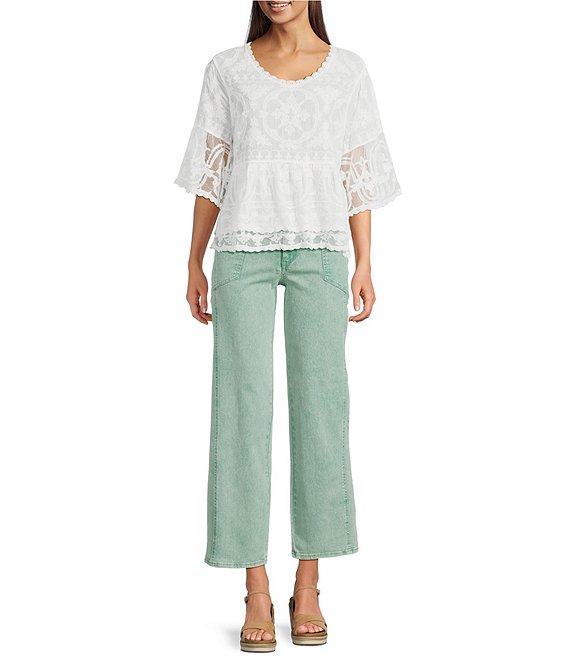 From Democracy, these pants feature: Relaxed fit Belt loops 5-pocket style Straight leg Straight hem Button and zip fly closure Approx. 28" inseam, 18" leg opening, 11" front & back rise Cotton/spandex Machine wash/line dry Imported.