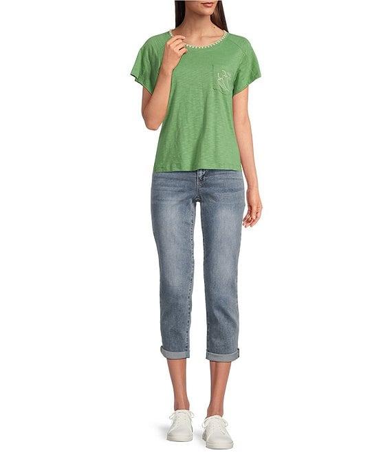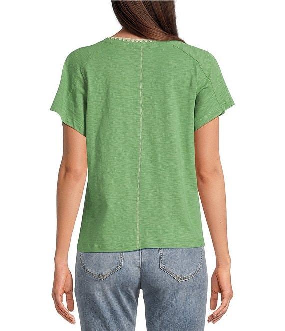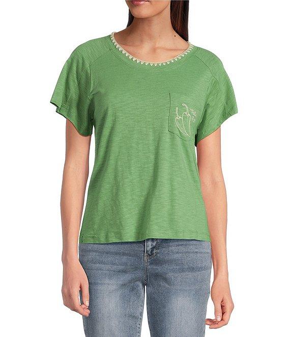From Democracy, this tee features: Knit fabrication Scoop neckline Short sleeves Embroidery on functional pocket and at neckline Pullover construction Polyester/cotton/spandex Cotton/modal machine wash/tumble dry Imported.