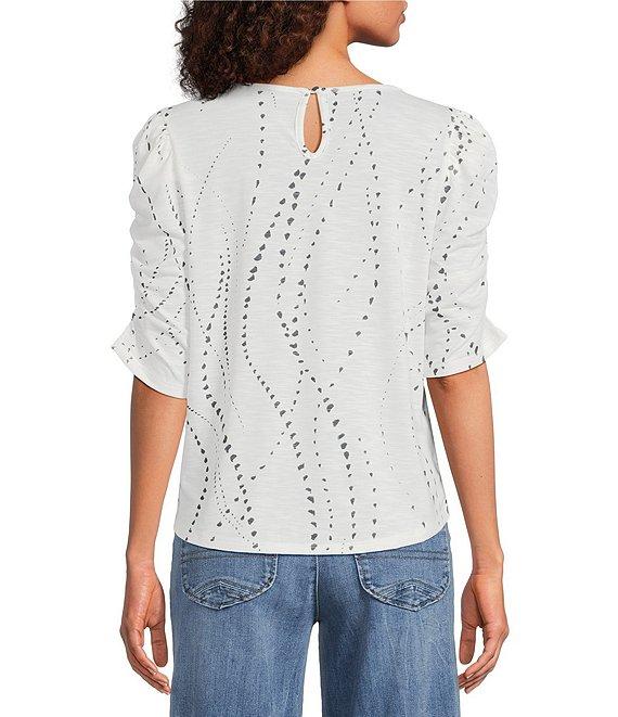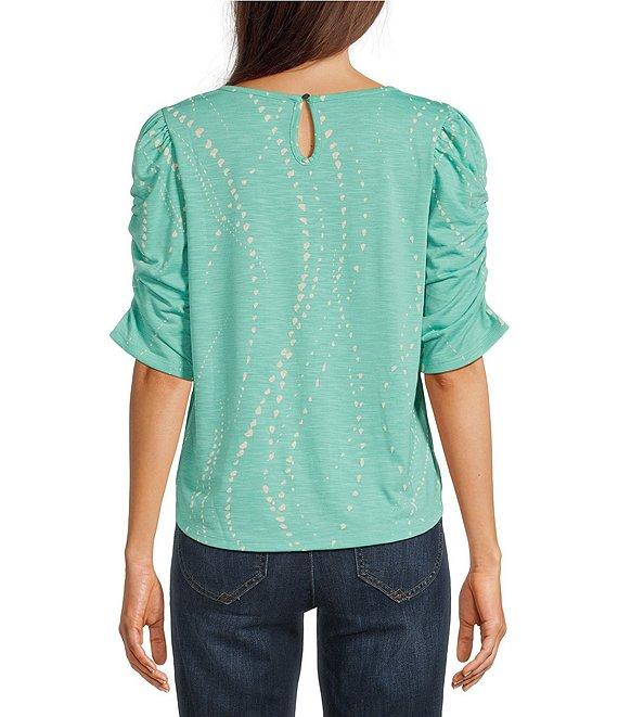 From Democracy, this top features:Stretch knit fabricationScoop necklineRuched elbow-length sleevesRelaxed fitDot printShirttail hemKeyhole button back closure at neckPolyester/rayon/spandexMachine wash/ line dryImported.