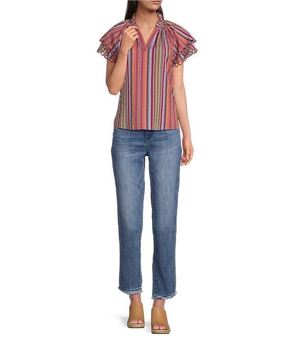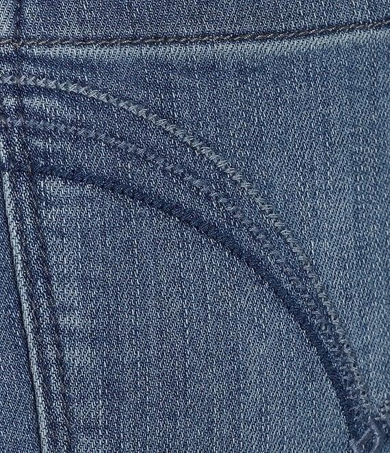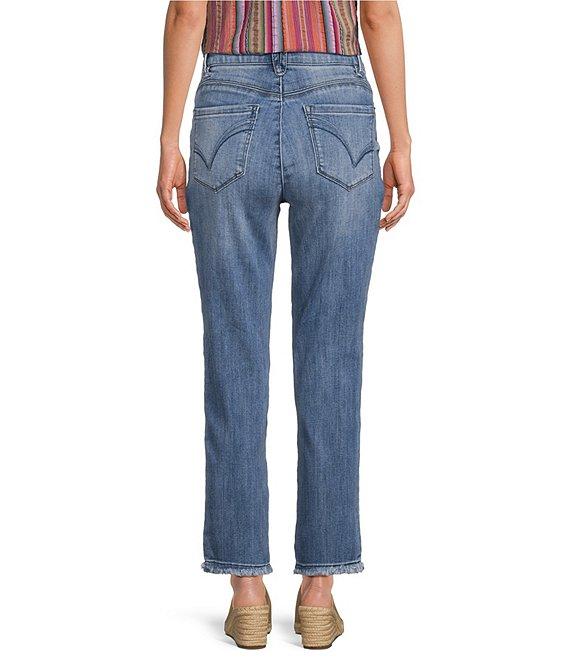 From Democracy Petite, these jeans feature: Stretch denim fabrication High rise Straight slim leg Belt loops 5-pocket style Embroidered back pocket Fray hem Button and zip fly closure Approx. 25" inseam Cotton/polyester/rayon/spandex Machine wash/tumble dry Imported.