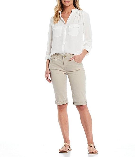 From Democracy Petite, these shorts feature: Stretch fabrication Belt loops 5-pocket style Cuffed hemline Button and zip fly closure Approx. 11.5" cuffed, 13.5" uncuffed inseam, 17" leg opening Cotton/spandex Machine wash Imported.