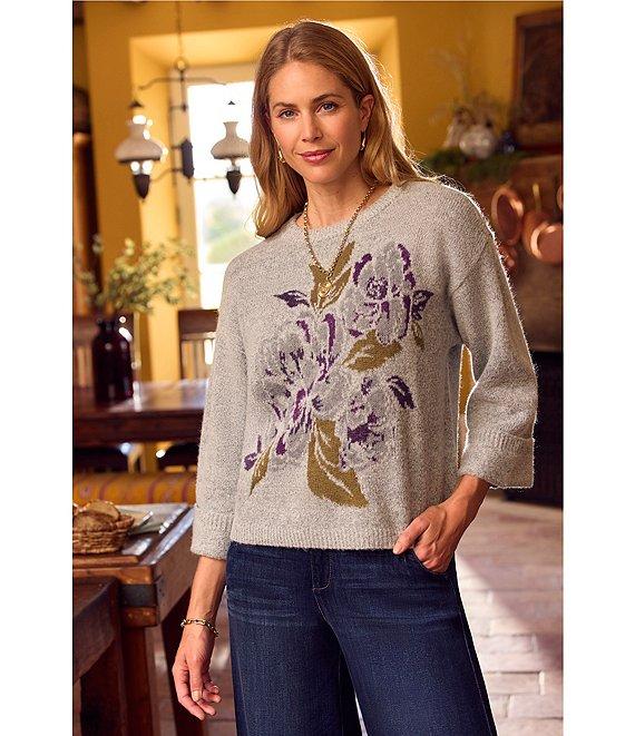 From Democracy Petite, this sweater features: Jacquard fabrication Round neckline Long sleeves Floral print Dropped shoulders Ribbed at neck, cuffs and hem Straight hem Pullover construction Acrylic/nylon/wool Hand wash cold Imported.