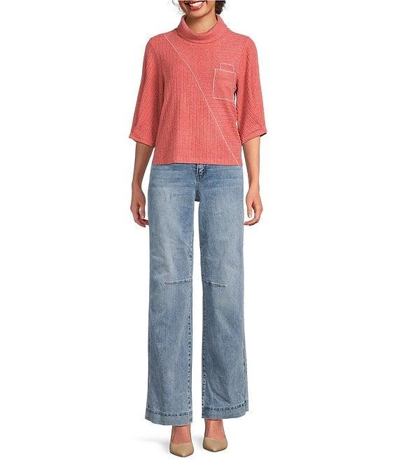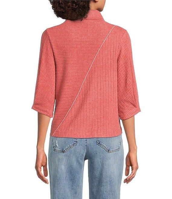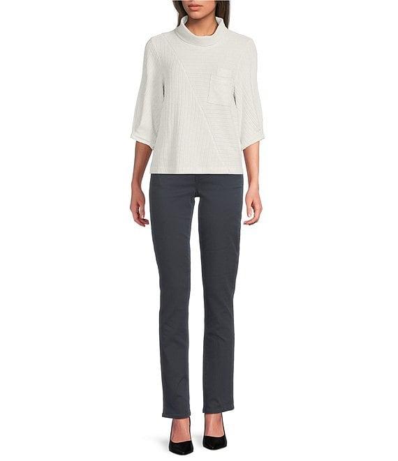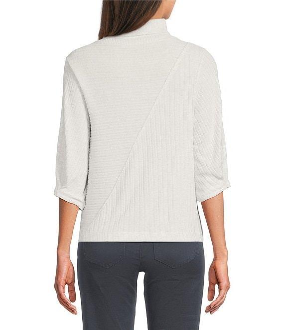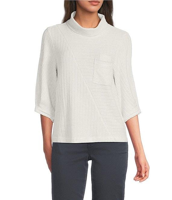 From Democracy Petite, this top features: Knit stretch fabrication Mock neckline Elbow length sleeves with pleat detail Dropped shoulders Diagonal lurex seaming detail Functional double patch pocket at chest Straight hem Pullover construction Polyester/rayon/spandex Machine wash/tumble dry Imported.
