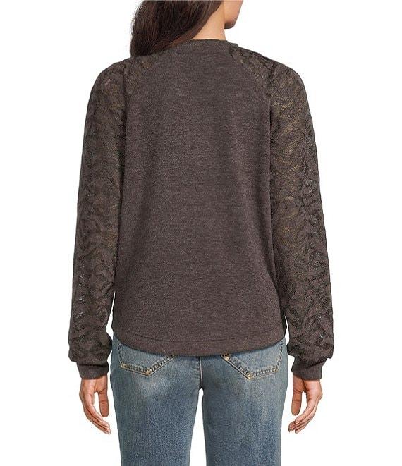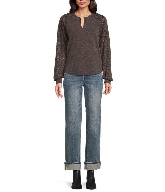 From Democracy Petite, this top features: Mix-media knit fabrication Split round neckline Long blouson sleeves with cuffs Relaxed fit Straight hem Pullover construction Self: polyester/rayon/spandex; contrast: polyester/rayon/lurex Machine wash Imported.
