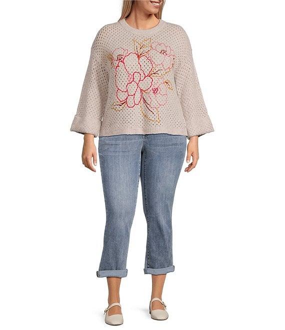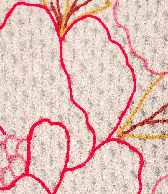 From Democracy Plus, this sweater features: Embroidered floral fabrication Round neckline Long dropped shoulder sleeves Allover openwork detail Ribbed detail at neck, cuffs and hem Straight hem Pullover construction Polyester/acrylic/nylon/spandex Hand wash cold Imported.
