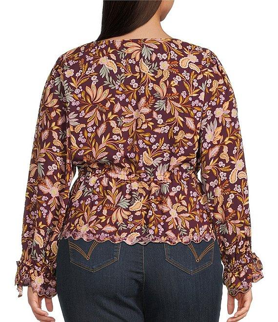 From Democracy Plus, this top features: Woven fabrication Peplum silhouette V-neckline Long sleeves with ties Relaxed fit Floral print Embroidery detail Scalloped edge detailing Pullover construction Polyester Machine wash cold Imported.