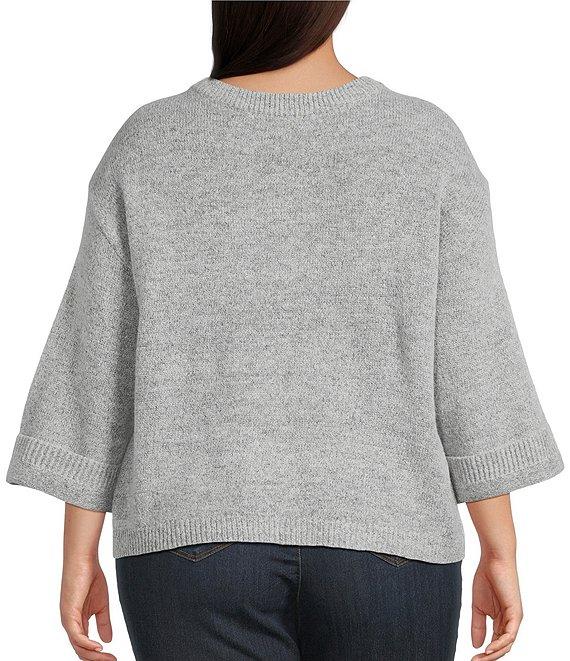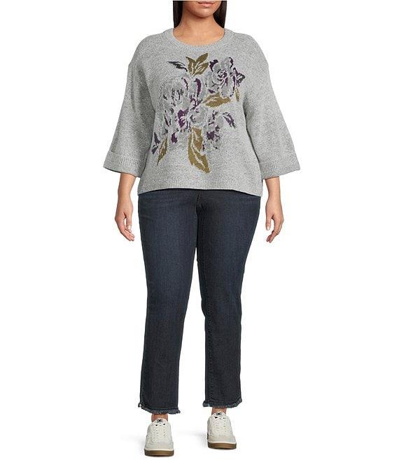 Democracy Plus Size Jacquard Floral Ribbed Round Neck Long Sleeve Sweater