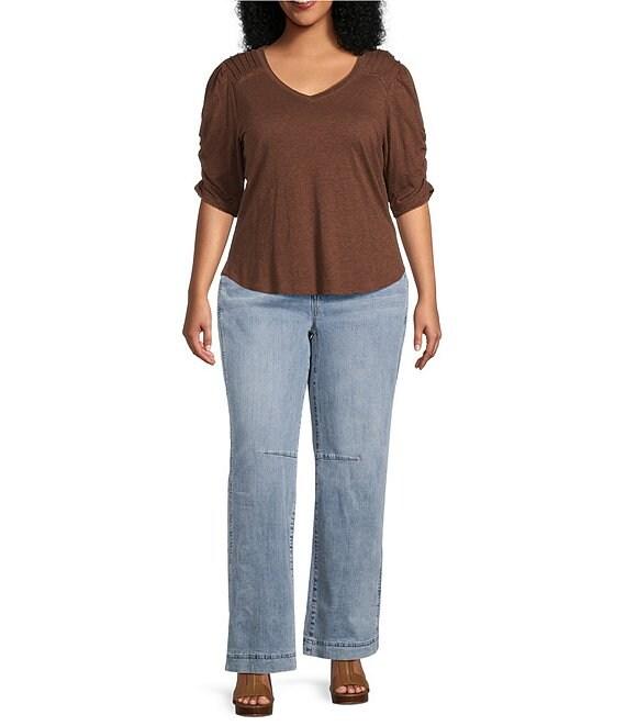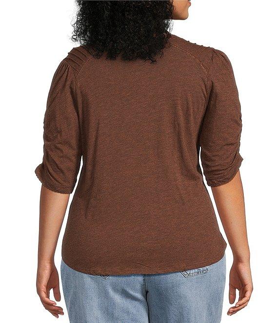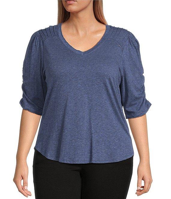 Democracy Plus Size Knit Scallop V-Neck Elbow Ruched Sleeve Crochet Detail Top