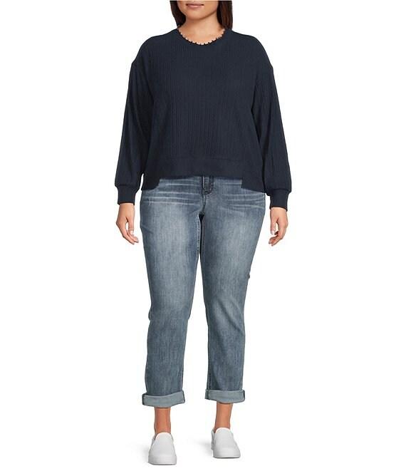 Democracy Plus Size Mixed Media Knit Embroidered Faux Pearl Scoop Neck Long Sleeve Top