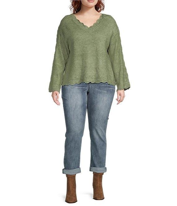 Democracy Plus Size Pointelle Scalloped Edge V-Neck Long Sleeve Sweater