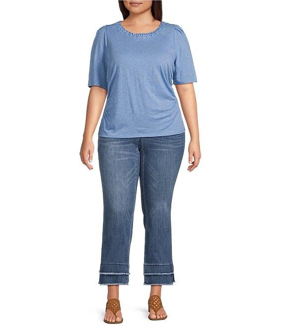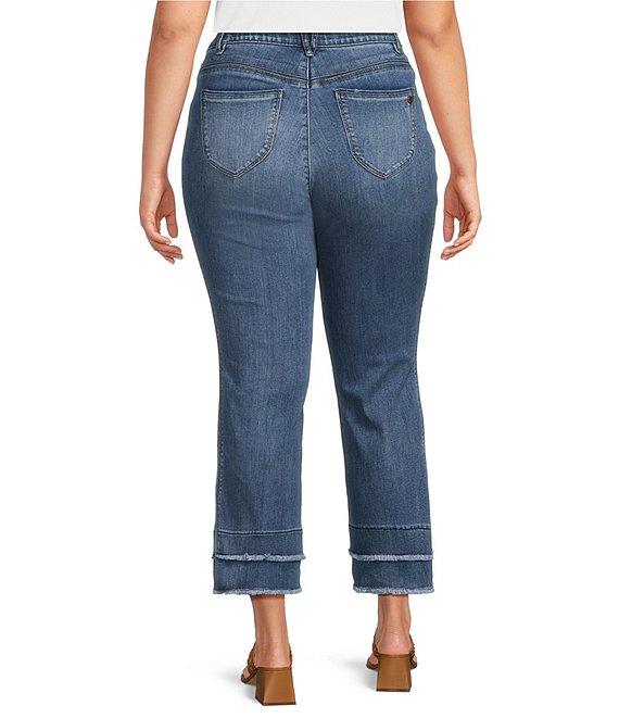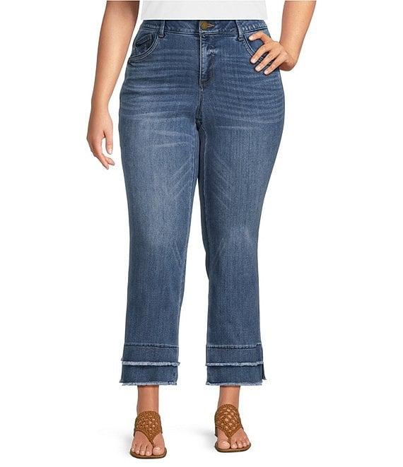 From Democracy Plus, these jeans features: Stretch denim fabrication Kick flare silhouette Belt loops 5-pocket style Double layer frayed hem Crop length Button/zip fly closure Approx. 26.5" inseam; 19" leg opening; 9" front & back rise Cotton/polyester/rayon/spandex Machine wash/tumble dry Imported.