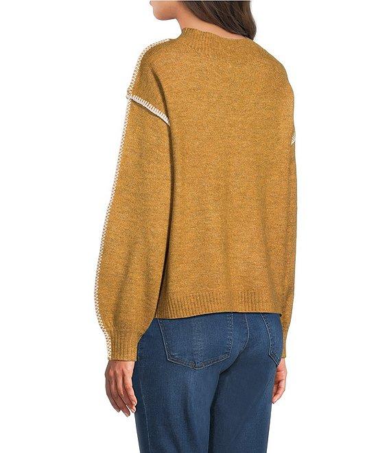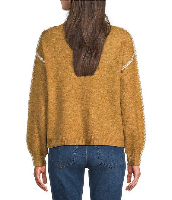 Democracy Surplice V-Neck Long Blouson Sleeve Embroidery Whipstitch Popover Sweater