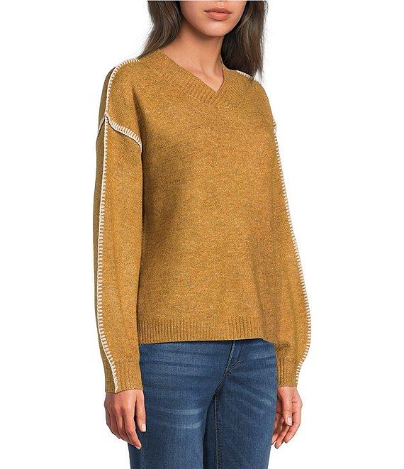 From Democracy, this sweater features: Surplice v-neckline Long blouson sleeves Dropped shoulders Embroidered whipstitch detail Ribbed neckline, cuffs and hem Pullover construction Acrylic/polyester/spandex Hand wash cold Imported.