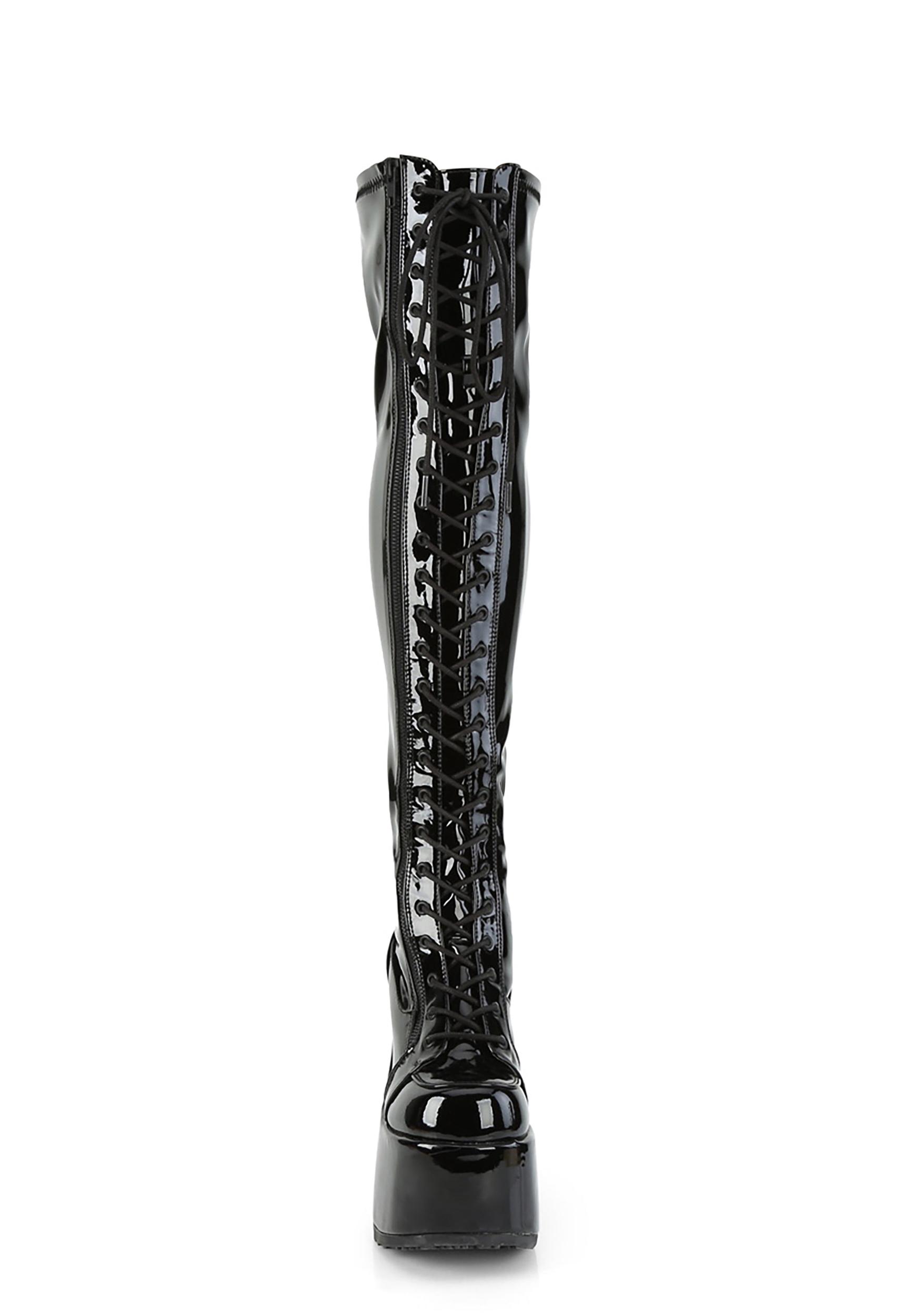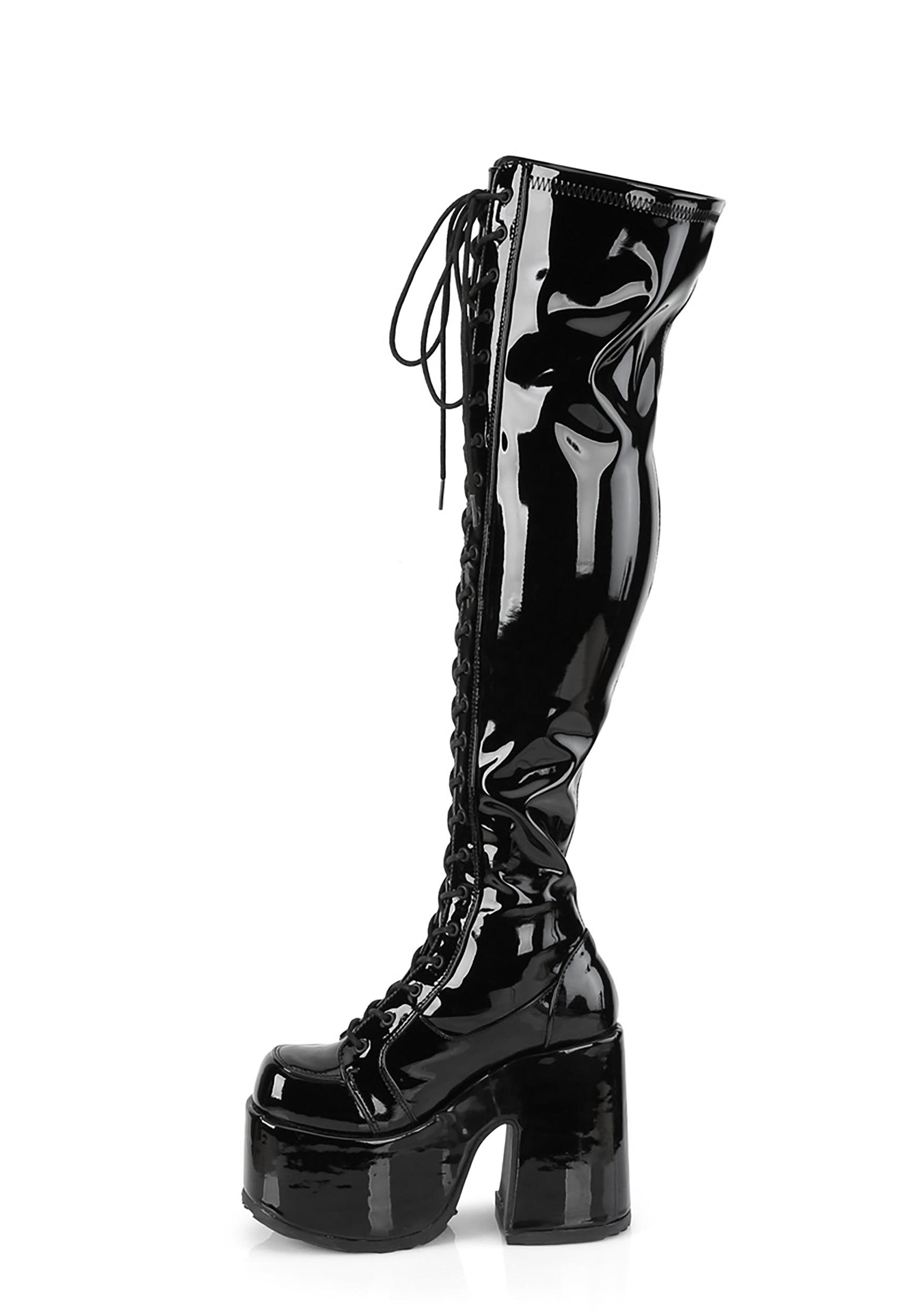 Demonia Camel-300 Patent Thigh High Chunky Heel Platform Boots