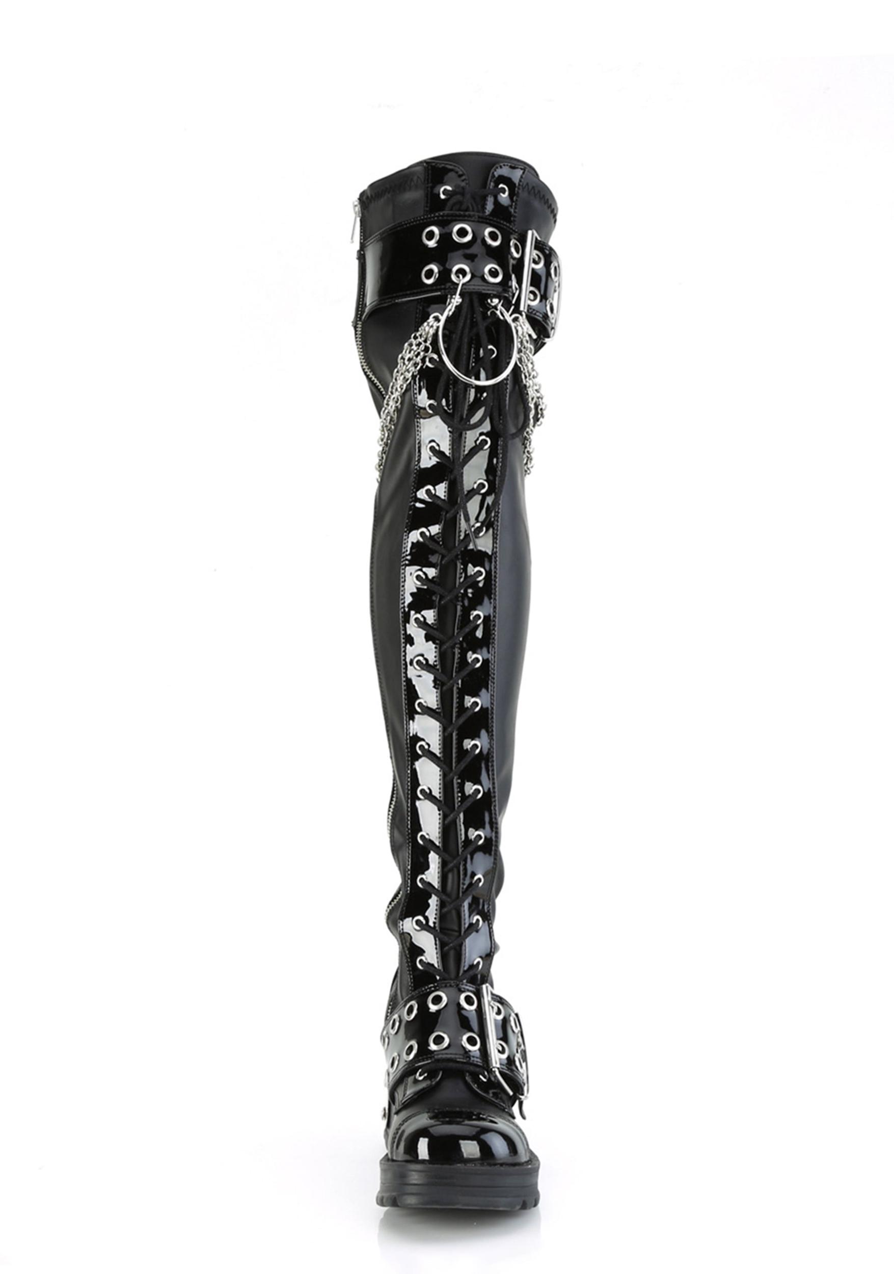 Demonia Knee High Vegan Leather Chain Buckle Boots - Black