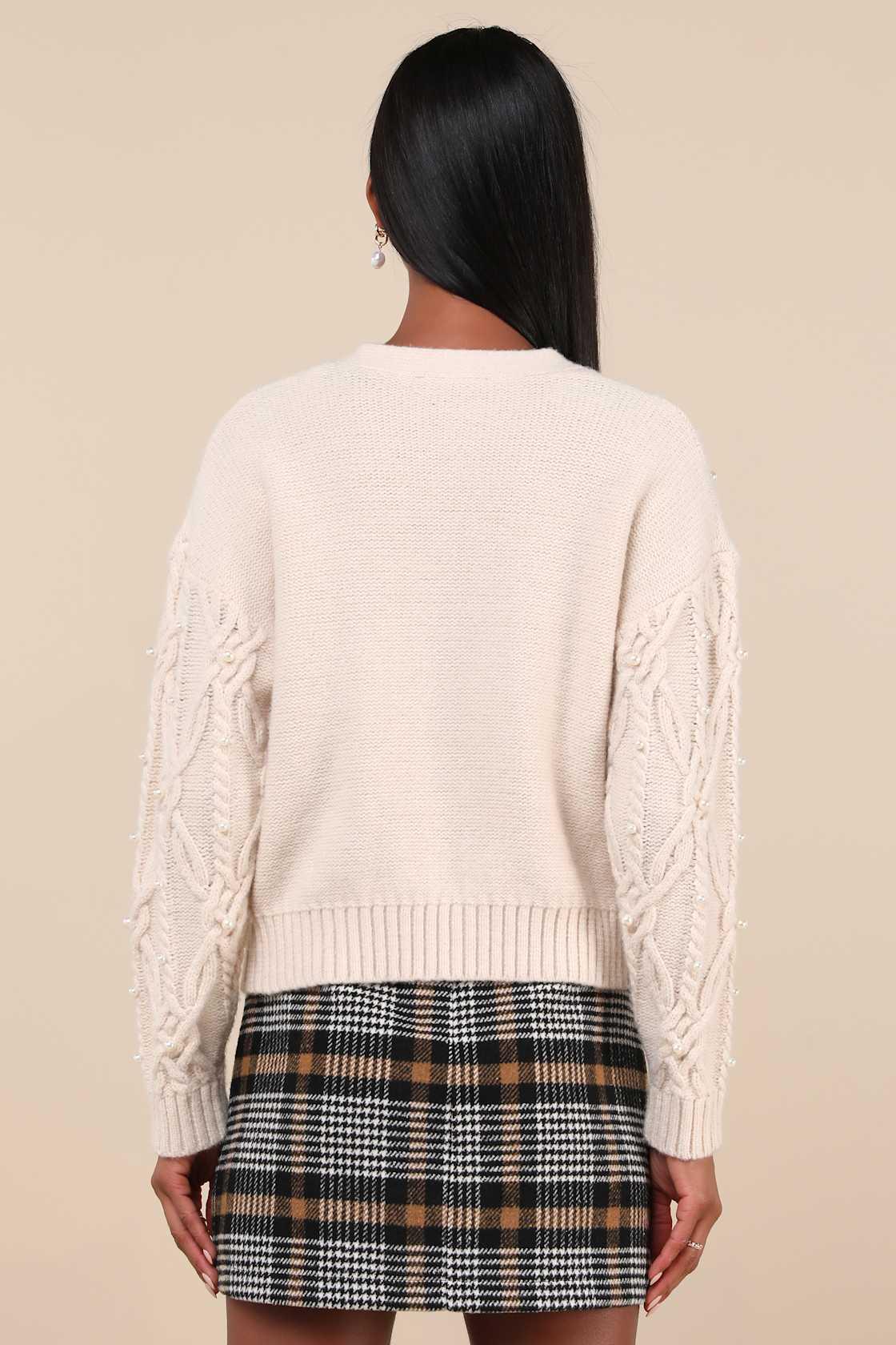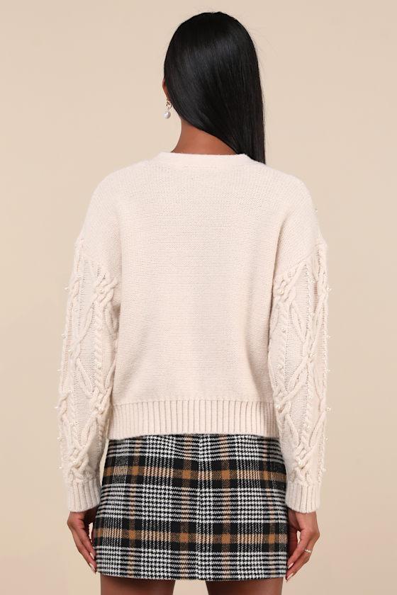 Snuggle up in the sweetest style with the Lulus Demure Sweetheart Cream Cable Knit Pearl Cardigan Sweater! Chunky cable knit boasts gleaming faux pearl accents across the boxy cardigan silhouette. Long sleeves with fitted cuffs frame the relaxed bodice that features a V-neckline and a functional button placket. Ribbed knit accents the neckline, cuffs, and hem.